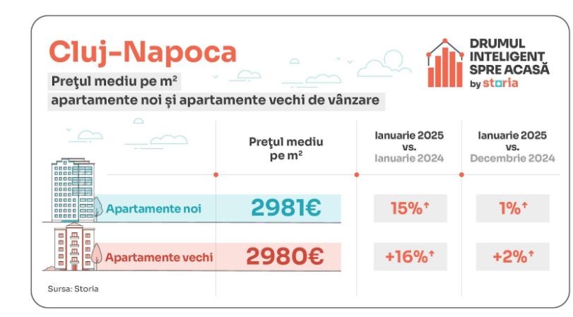 Concret, prețul mediu pentru apartamentele din Cluj-Napoca a fost de 2.981 euro/mp, în ianuarie 2025 în creștere cu 15% față de ianuarie 2024. Apartamentele noi au ajuns la un preț mediu de 2.981 euro/mp, iar cele vechi la 2.980 euro/mp.