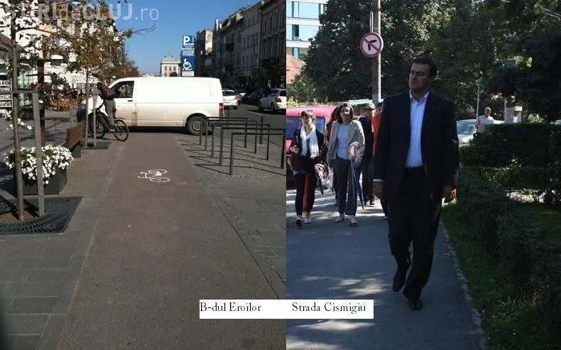 Exemplul cel mai clar vine de la Bulevardul Eroilor, unde soferul unei dubite a parcat pe trotuar, blocand total pista de biciclisti. Cazul este graitor, pentru ca vorbim de zona centrala a orasului, unde politistii comunitari "roiesc" in numar mare.
