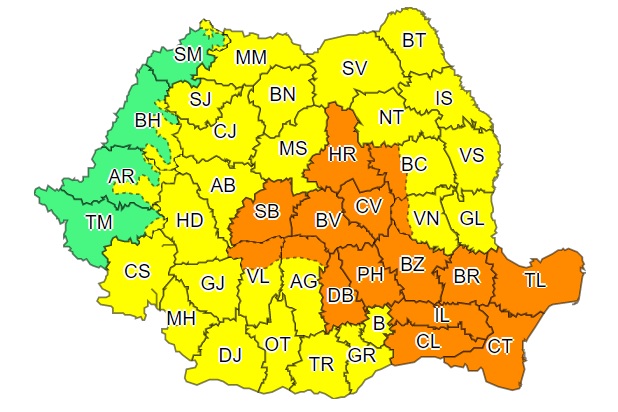 Meteorologii de la ANM au emis o nouă serie de avertismente de tip cod galben și portocaliu de vreme rea, care afectează 36 de județe din țară, printre care și Clujul.
