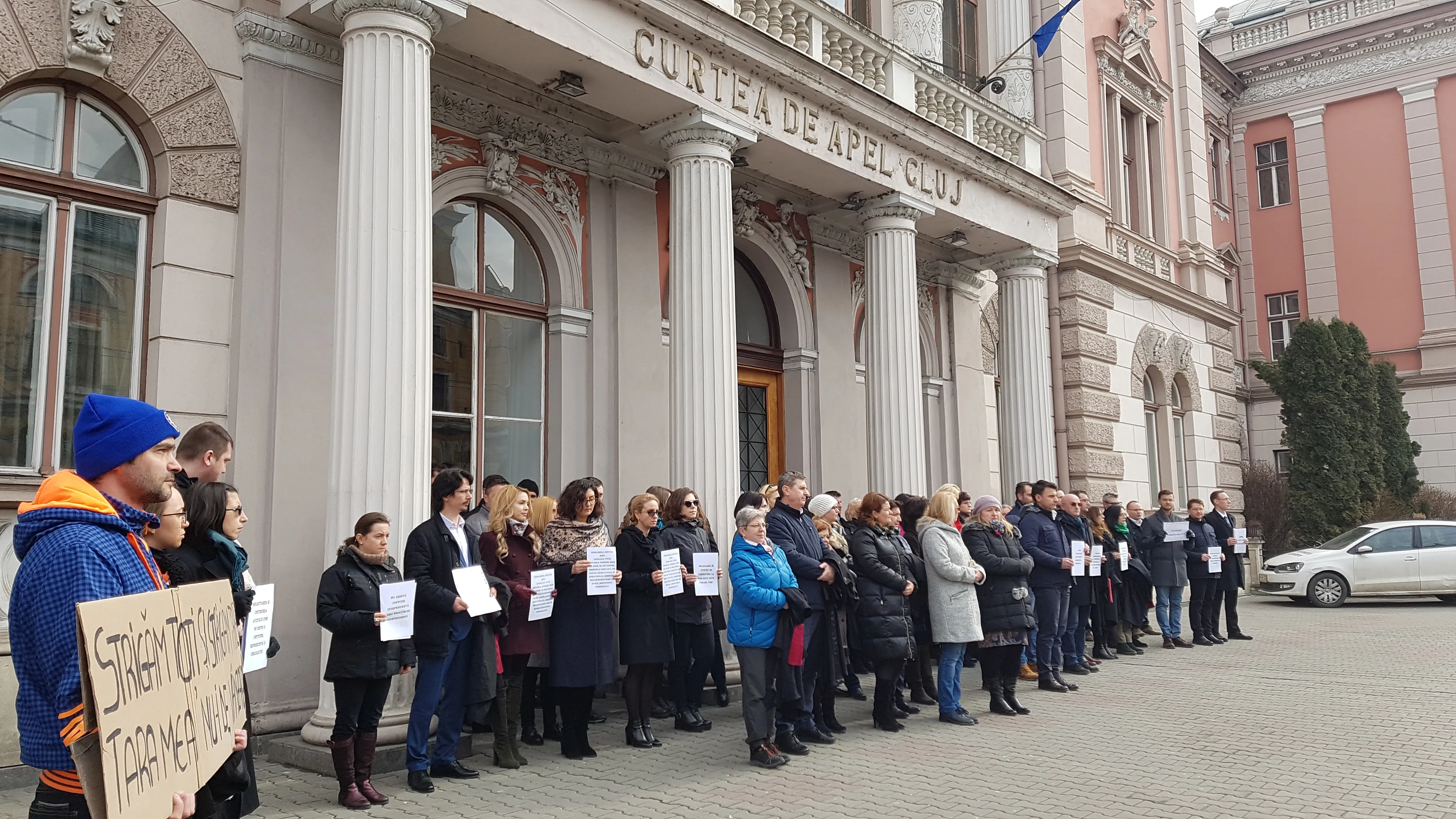 Magistrații clujeni care sunt azi aici reprezintă judecători, procurori, procurori la DIICOT și la DNA, care doresc să atenționeze populația că nu renunță la protest. În continuare avem activitatea blocată la nivelul Judecătoriei și a Tribunalului Cluj.