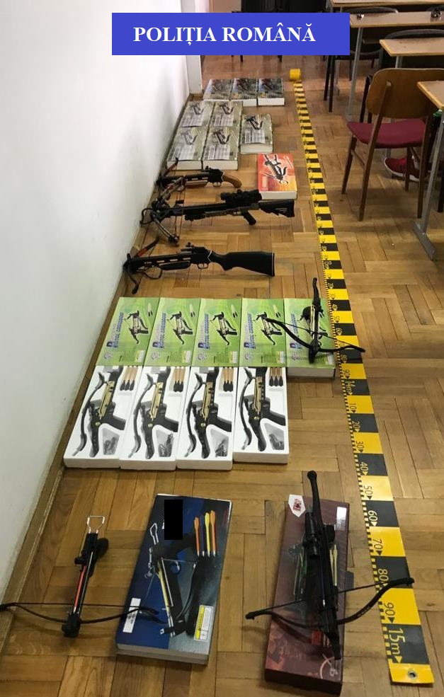 ”La data de 30 mai a.c., în urma investigațiilor efectuate de către polițiștii din cadrul Serviciului Arme, Explozivi și Substanțe Periculoase și cei din cadrul Poliției municipiului Gherla, a fost depistat un bărbat care deținea și oferea spre vânzare, fără drept, arbalete”, informează IPJ Cluj.