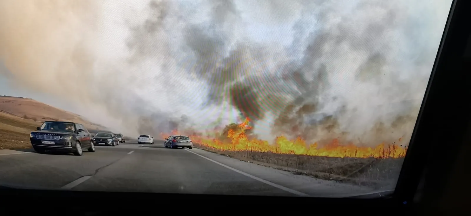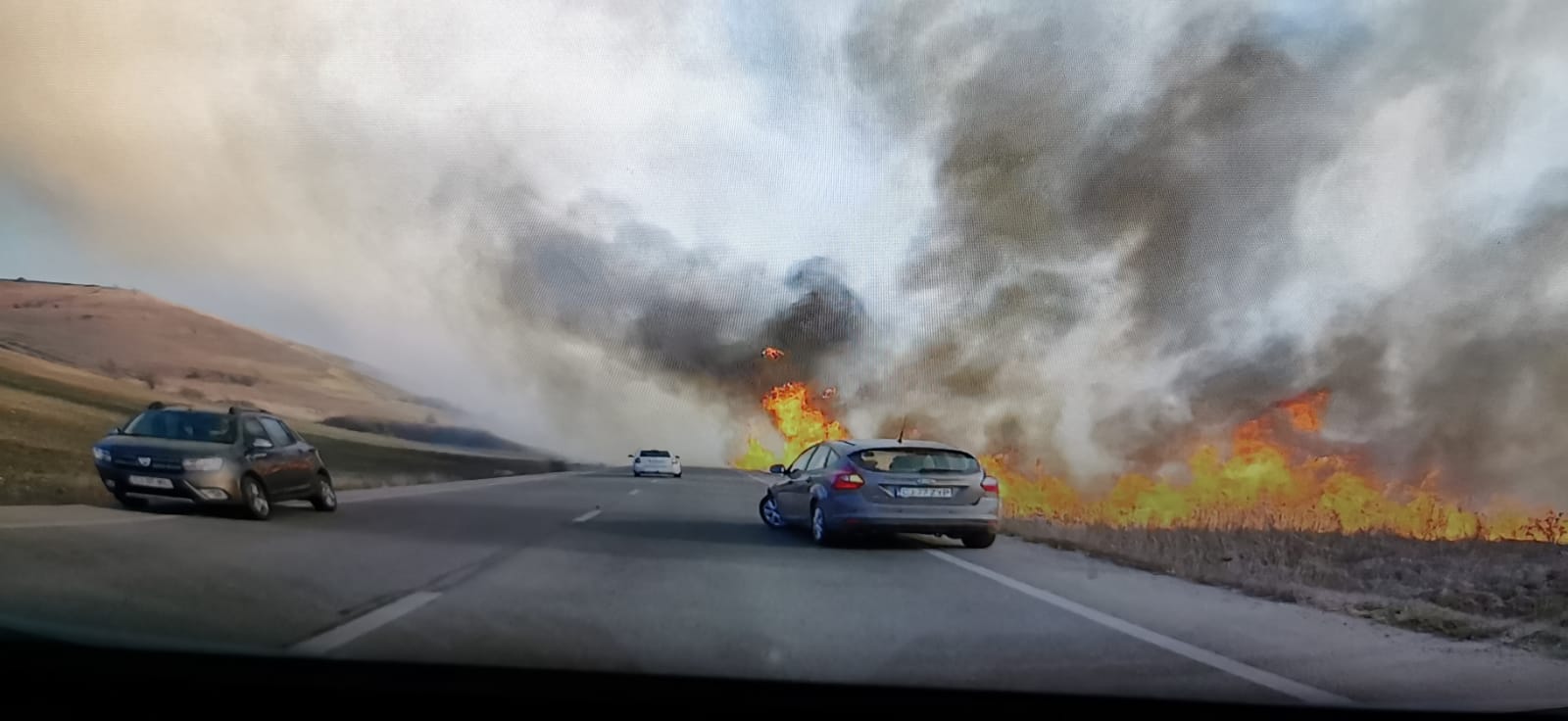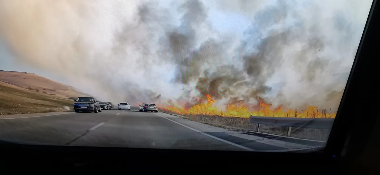 Focul a fost extrem de violent, iar la un moment dat a ajuns chiar pe drum, șoferii fiind nevoiți să oprească.