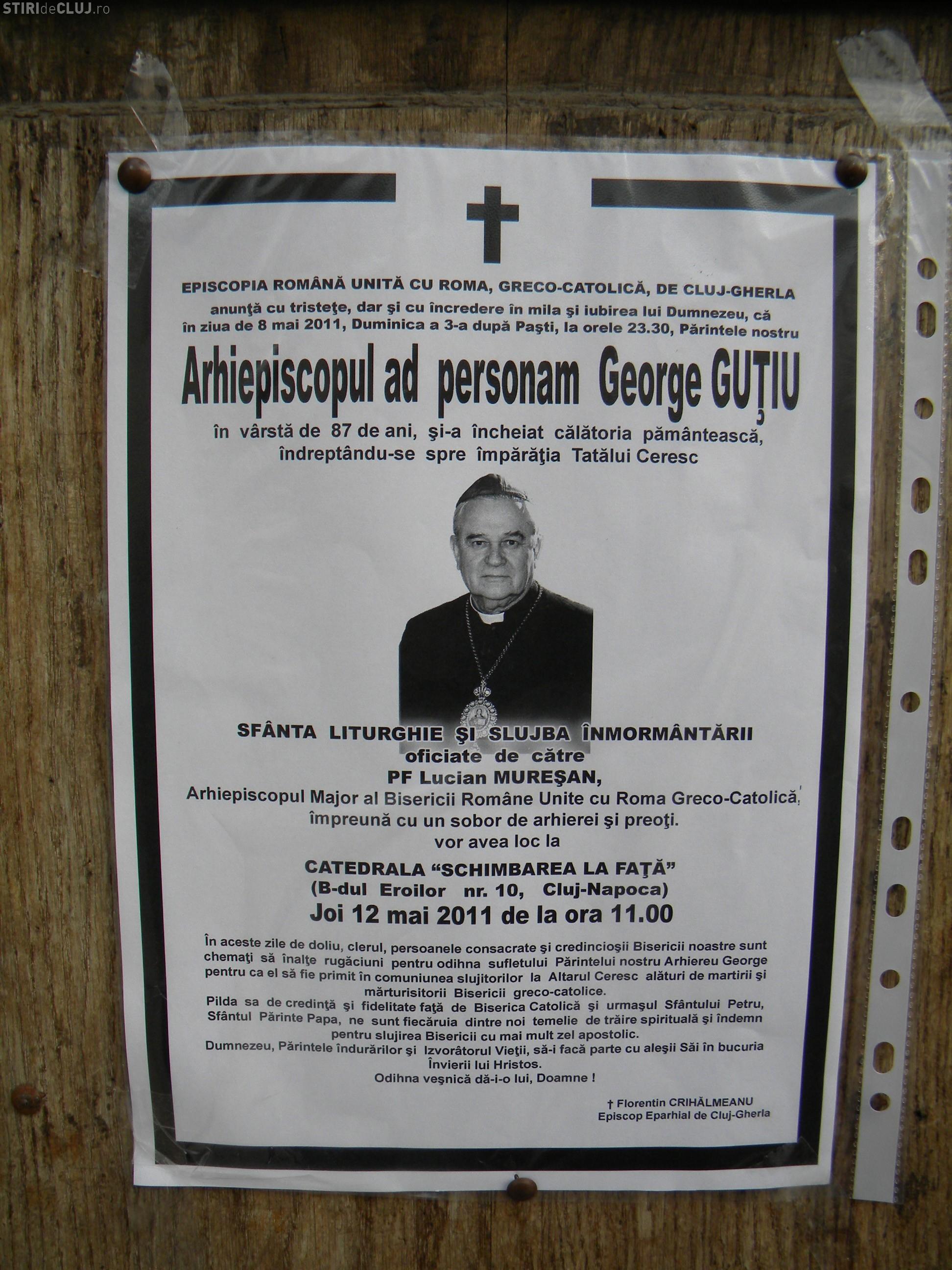 "In aceste zile de doliu, clerul, persoanele consacrate si credinciosii Bisericii noastre sunt chemati sa inalte rugaciuni pentru odihna suftelului Parintelui nostru Arhiereu George pentru ca el sa fie primit in comuniunea slujitorilor la Altarul Ceresc alaturi de martirii si marturisitorii Bisericii greco-catolice. Pilda sa de credinta si de fidelitate fata de Biserica Catolica si urmasul Sfantului Petru, Sfantul Parinte Papa, ne sunt fiecaruia dintre noi temelie de tarie spirituala si indemn pentru slujirea Bisericii cu mai mult zel apostolic", a spus Florentin Crihalmeanu, Episcopul Eparhial de Cluj-Gherla.