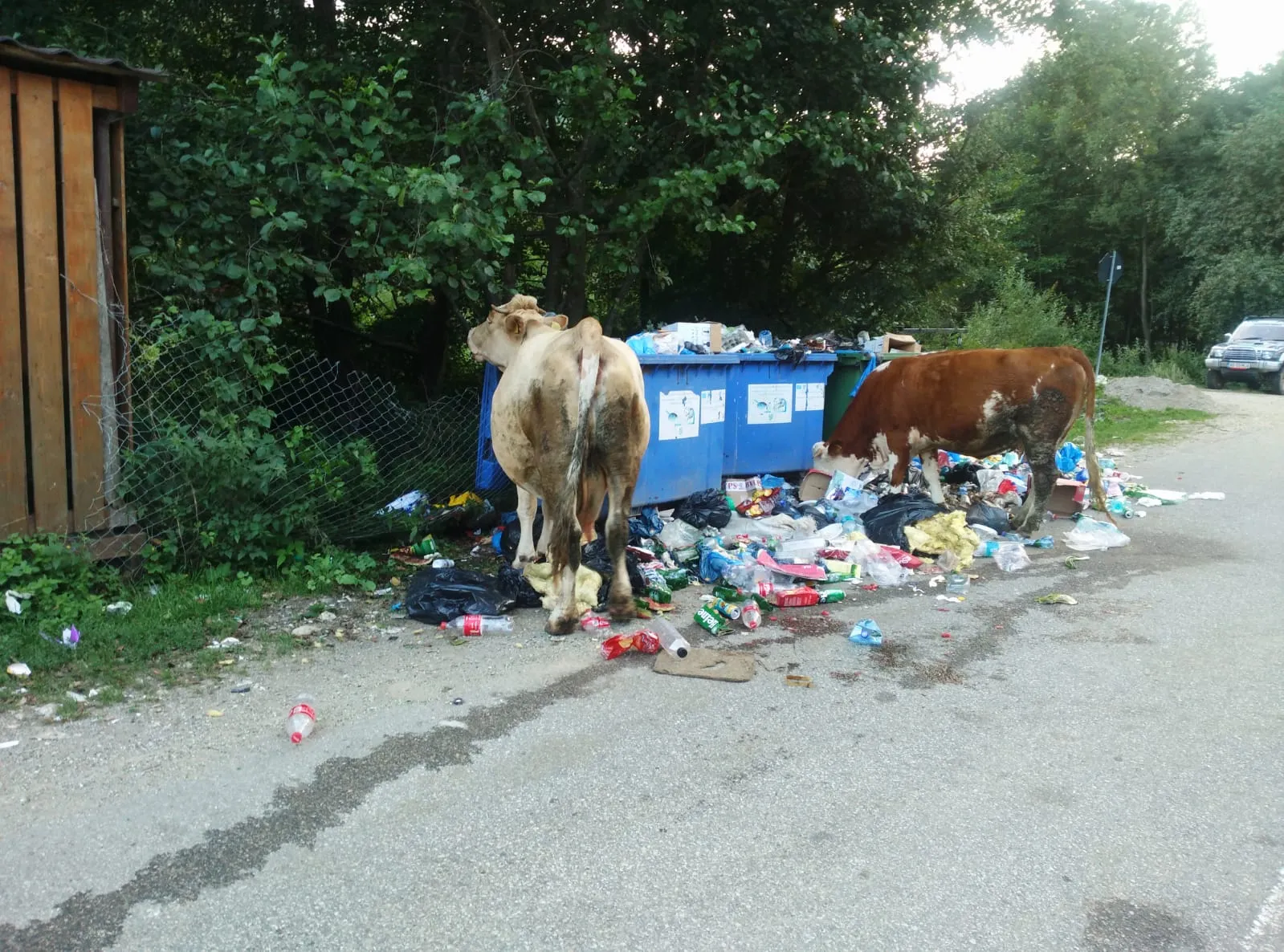 Pe raza comunei Băișoara, în stațiune și satul Moara de Pădure, vacile și caii pasc liniștiți în tomberoane.
