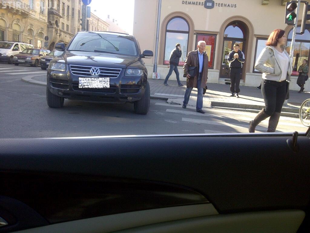 Un șofer a ”parcat” direct pe trotuar, lângă Vertigo, sfidând orice regulă a bunului simț. Și-a urcat mașina 4X4 jumătate pe trotuar.