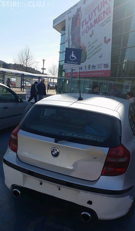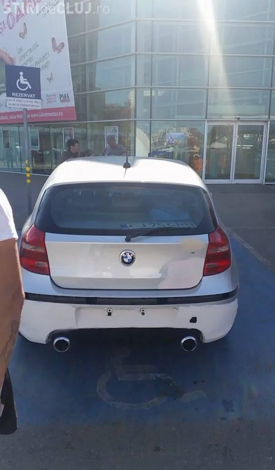 Proprietarul unui BMW a fost fotografiat în parcarea unui supermarket din Cluj-Napoca.
