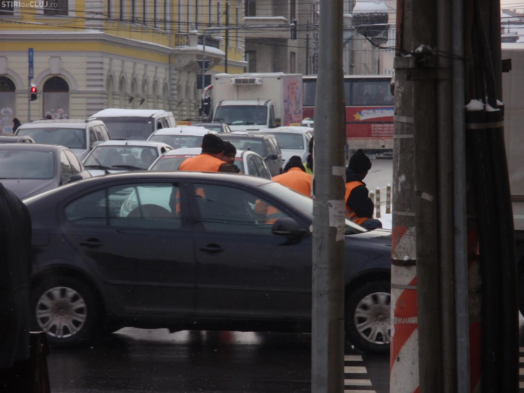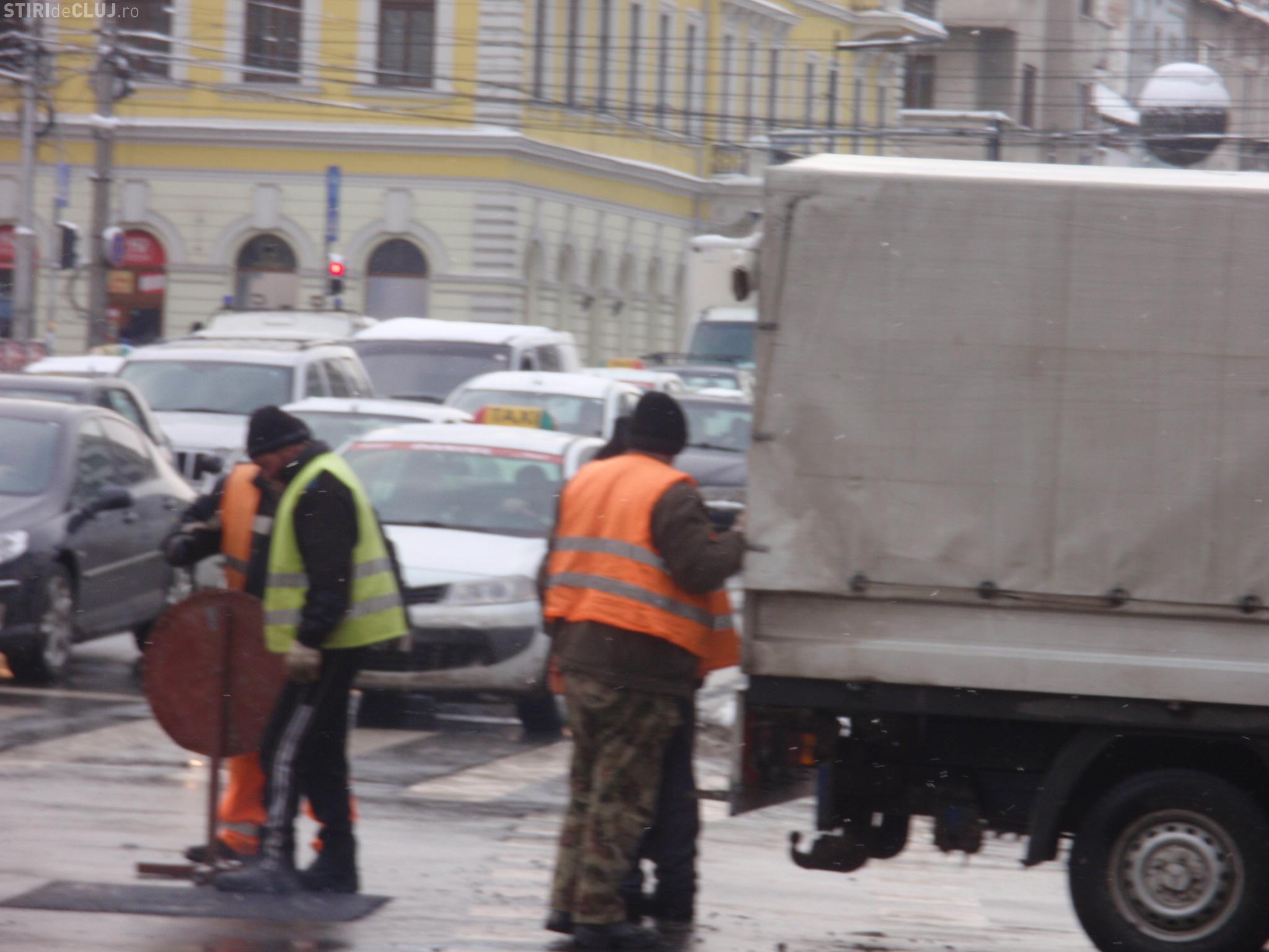 Muncitorii care asfaltau marti, in jurul orei 13.00, in Piata Avram Iancu au fost luati la rost de clujenii care asteptau la trecerea de pietoni.