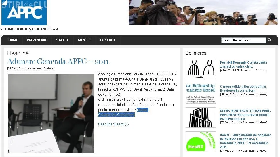 Ultimele noutati sunt disponibile pe coloana din dreapta, la categoria 'De interes'. Un continuare, pe aceeasi coloana pot fi consultate linkuri catre site-urile institutiilor media clujene, blogurile jurnalistilor, fotojurnalistilor si patronilor de presa", a precizat presedintele APPC, jurnalistul Adrian M. Popa.