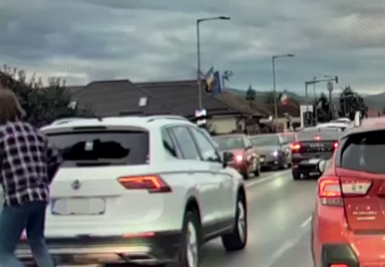 Din imagini se poate observa cum tânărul cobora din mașină și se îndreaptă spre un Volkswagen Tiguan, care circulă în fața lui. Într-o clipă acesta lovește cu un obiect necunoscut luneta mașinii, care se sparge în bucăți. Într-un final, păgubitul a coborât și el pentru a cere explicații