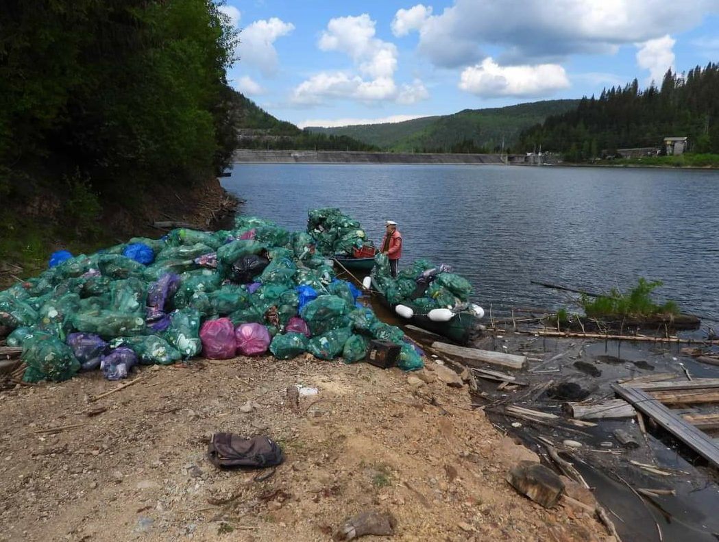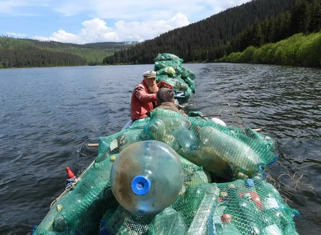 Nea Ilie, acuzat că folosește barca poluantă pe lacul Beliș, transporta duminică dimineața saci cu pet -uri adunate de pe apă.