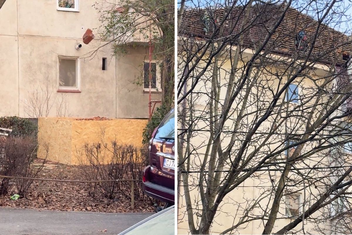 Doi muncitori care repară acoperișul unui bloc de patru etaje, situat în cartierul Gheorgheni din Cluj-Napoca, au fost surprinși în timp ce aruncă țiglele pe jos, fără să țină cont că ar putea răni pe cineva.