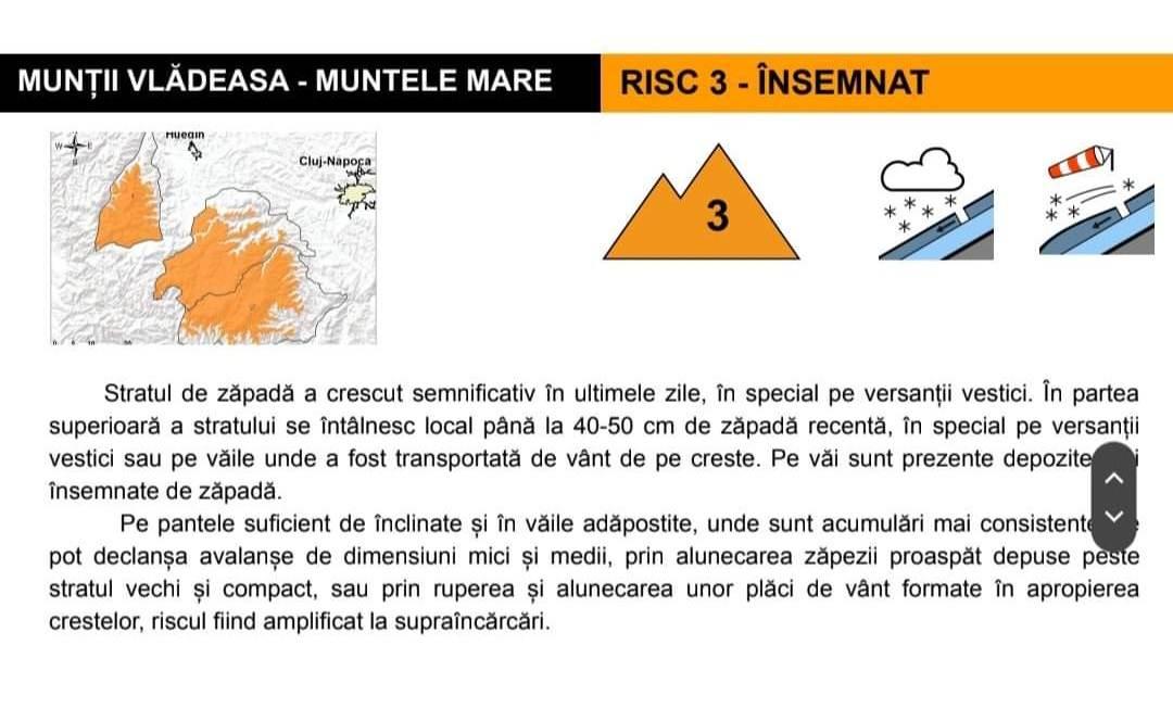 Cei care cred că acum ar fi momentul potrivit să-și petreacă timpul la munte, trebuie să fie extrem de prudenți, căci Dispeceratul Național Salvamont a anunțat că există un pericol de declanșare a avalanșelor în mai multe zone din țară, inclusiv la Vlădeasa.