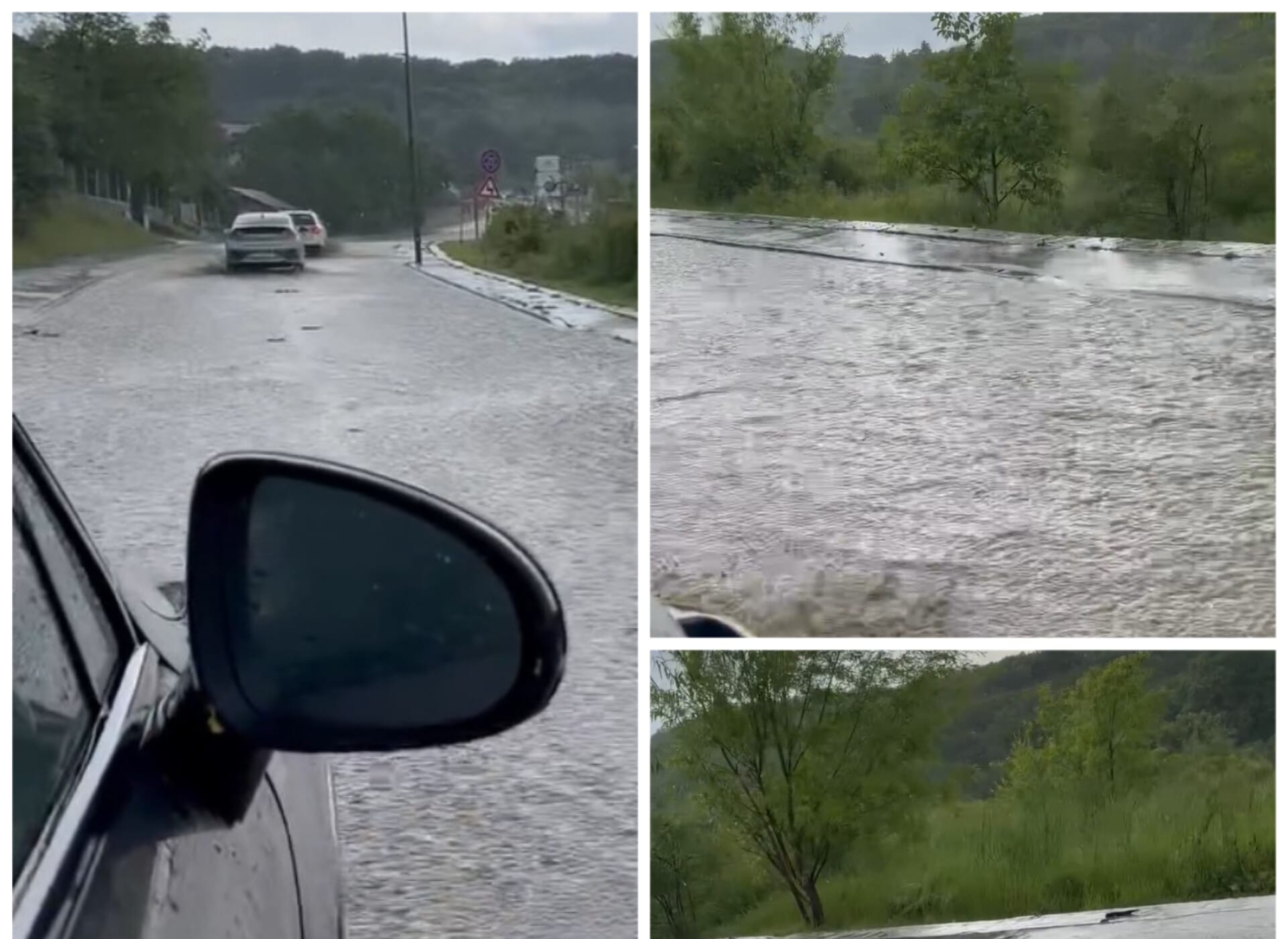 Atenție! Drum surpat înainte de camping-ul din Făget, Cluj! Circulați cu prudență pentru că șoseaua e acoperită de apă- FOTO VIDEO