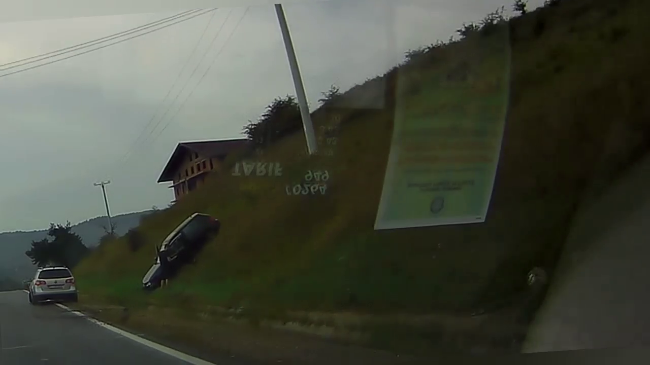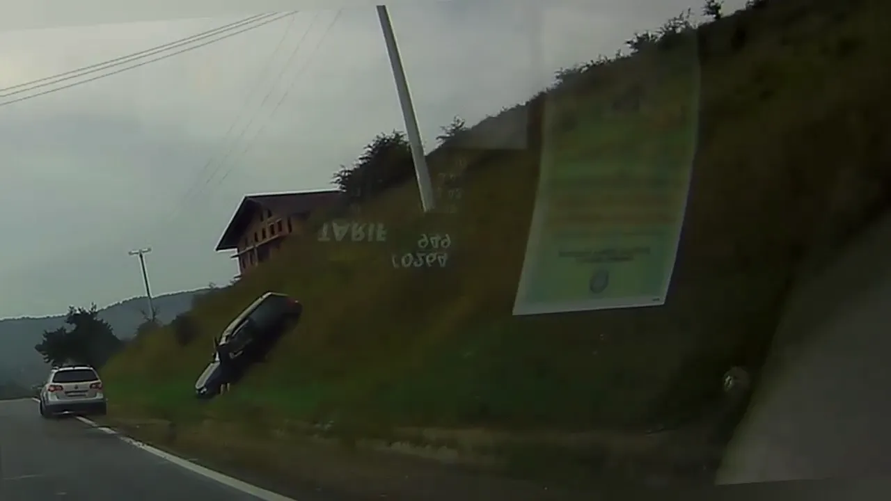 Un șofer cu camera pe bord a filmat un accident produs pe DN 1, între Vâlcele și Feleacu. O mașină a ieșit în decor și stătea suspendată pe dealul de pe marginea drumului.