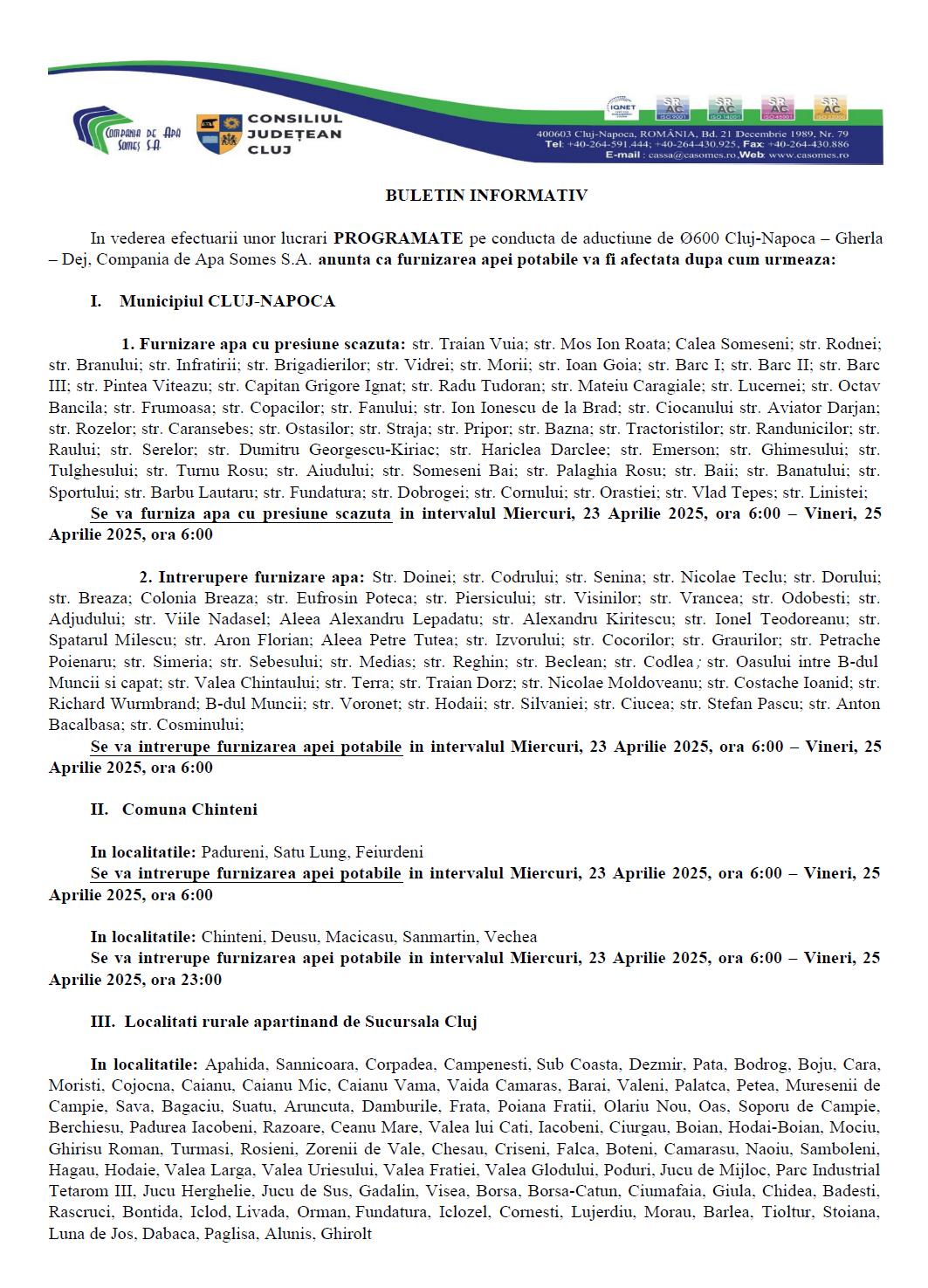 Compania de Apă Someș S.A. anunță ca va urma o întrerupere masivă a furnizării apei potabile în municipiul Cluj-Napoca, precum și în mai multe localități din județul Cluj, ca urmare a efectuării unor lucrări programate pe conducta de aducțiune Ø600 Cluj-Napoca – Gherla – Dej.