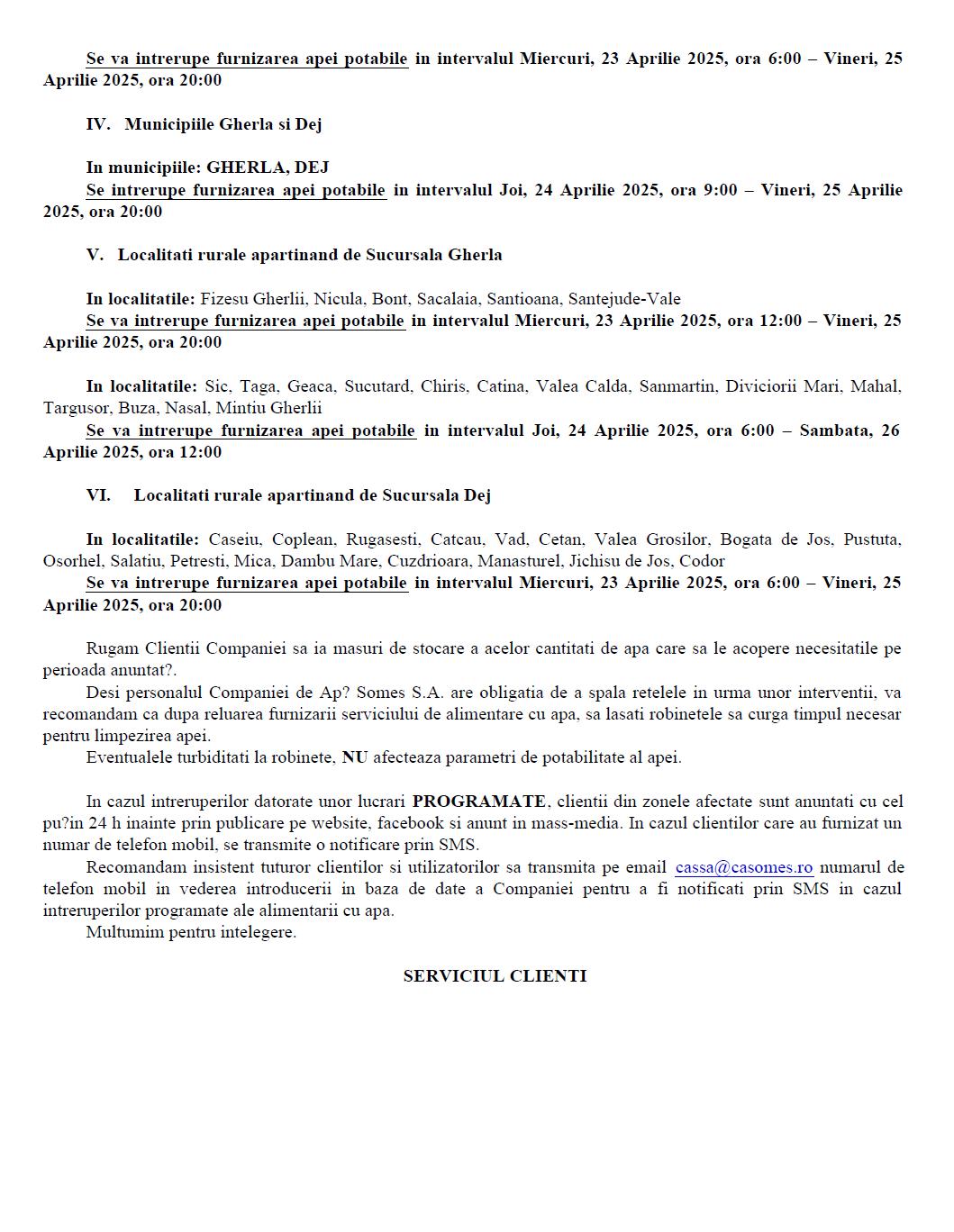 Pentru a fi notificați în cazul întreruperilor programate, clienții sunt încurajați să furnizeze numărul lor de telefon mobil prin e-mail la adresa cassa@casomes.ro.
