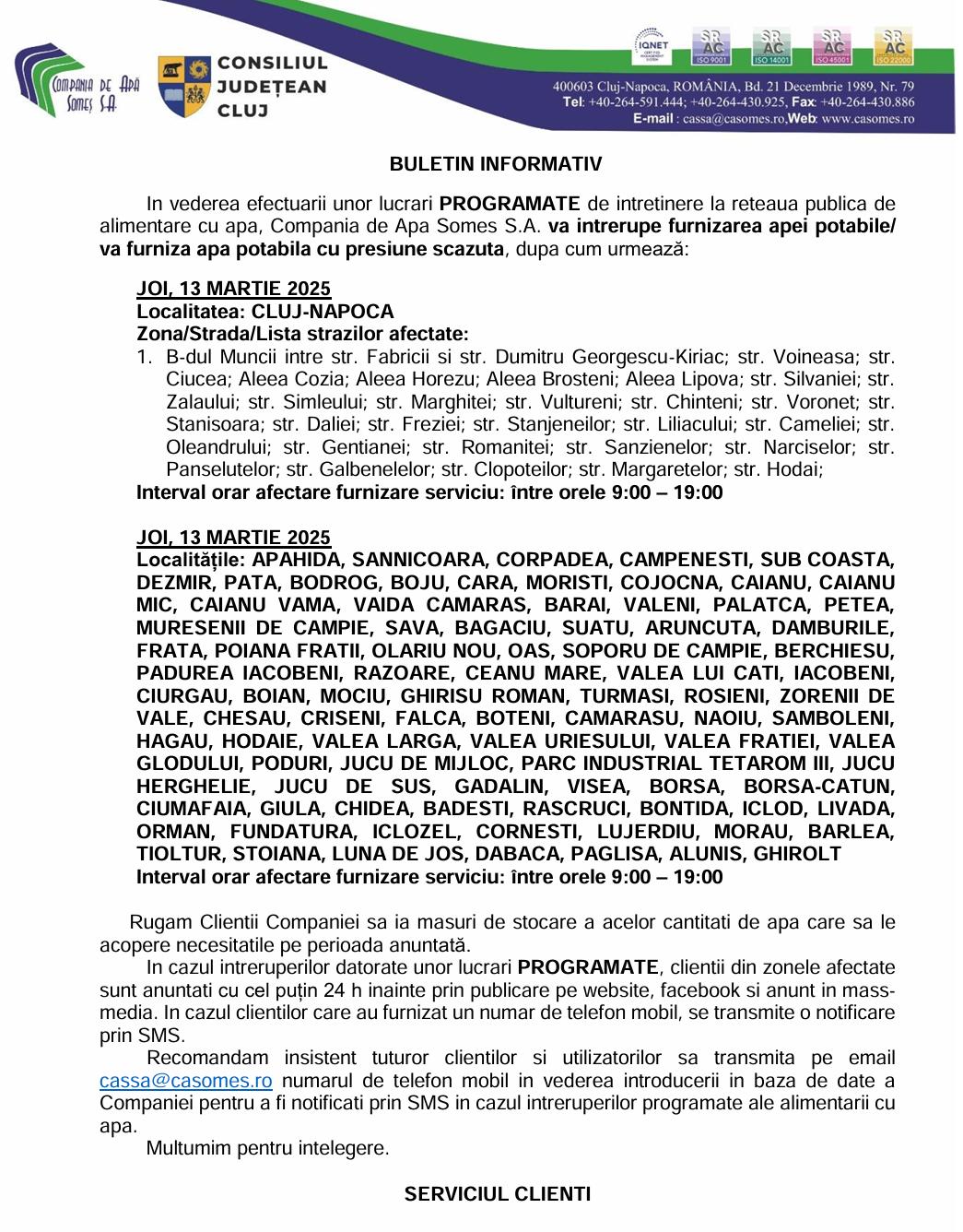 Compania de Apă Someș S.A. informează că, în vederea efectuării unor lucrări programate de întreținere la rețeaua publică de alimentare cu apă, va întrerupe furnizarea apei potabile sau va furniza apă cu presiune scăzută în mai multe zone, după cum urmează: