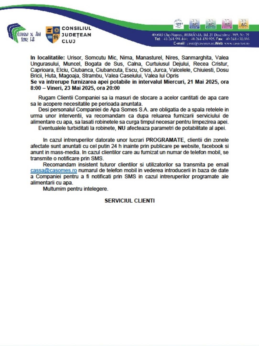 Zeci de mii de locuitori din municipiul Cluj-Napoca, din Gherla, Dej și din zeci de localități rurale din județul Cluj se vor confrunta, începând cu data de 20 mai 2025, cu întreruperi majore în furnizarea apei potabile sau cu furnizarea acesteia la presiune scăzută, ca urmare a unor lucrări programate de către Compania de Apă Someș S.A.