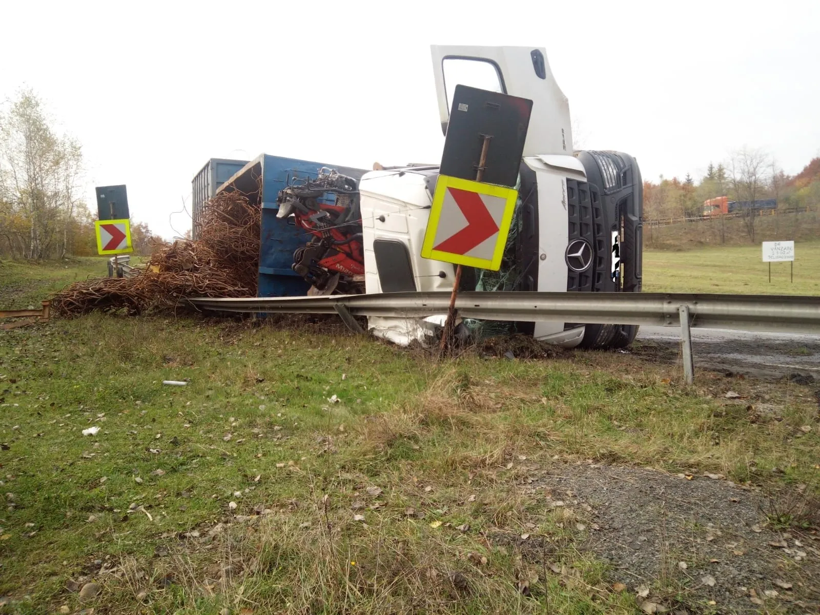 Din primele informații, este vorba despre un camion răsturnat pe marginea drumului.