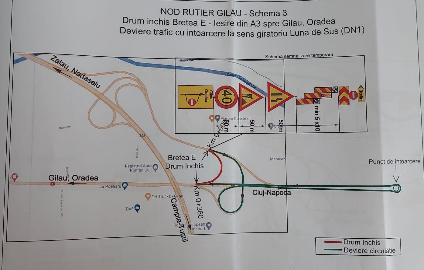 ,,Restricții de circulație în data de 23.07.2024, intervalul orar 08:00 – 18:00 pe A3, Nod Rutier Gilău, Bretea E (direcția A3 ieșire în DN 1 spre Oradea).