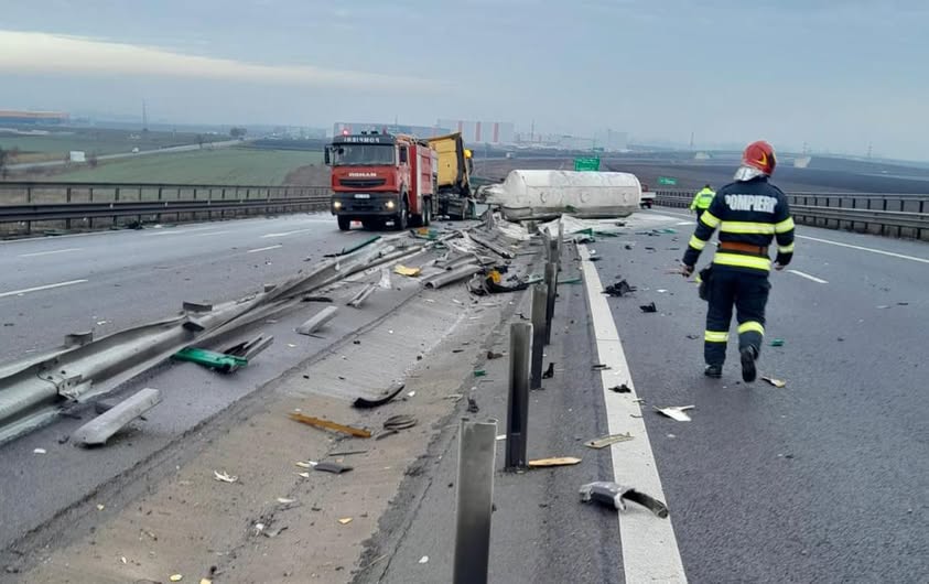 ,,Pompierii din cadrul Detașamentului Turda asigură măsuri specifice de prevenire și stingere a incendiilor, după ce o autocisternă s-a răsturnat pe A10. Din primele date, cisterna transporta var. Din fericire, nu există persoane care să solicite îngrijiri medicale. La fața locului a fost trimis un echipaj cu o autospecială cu apă și spumă", a transmis ISU Cluj.