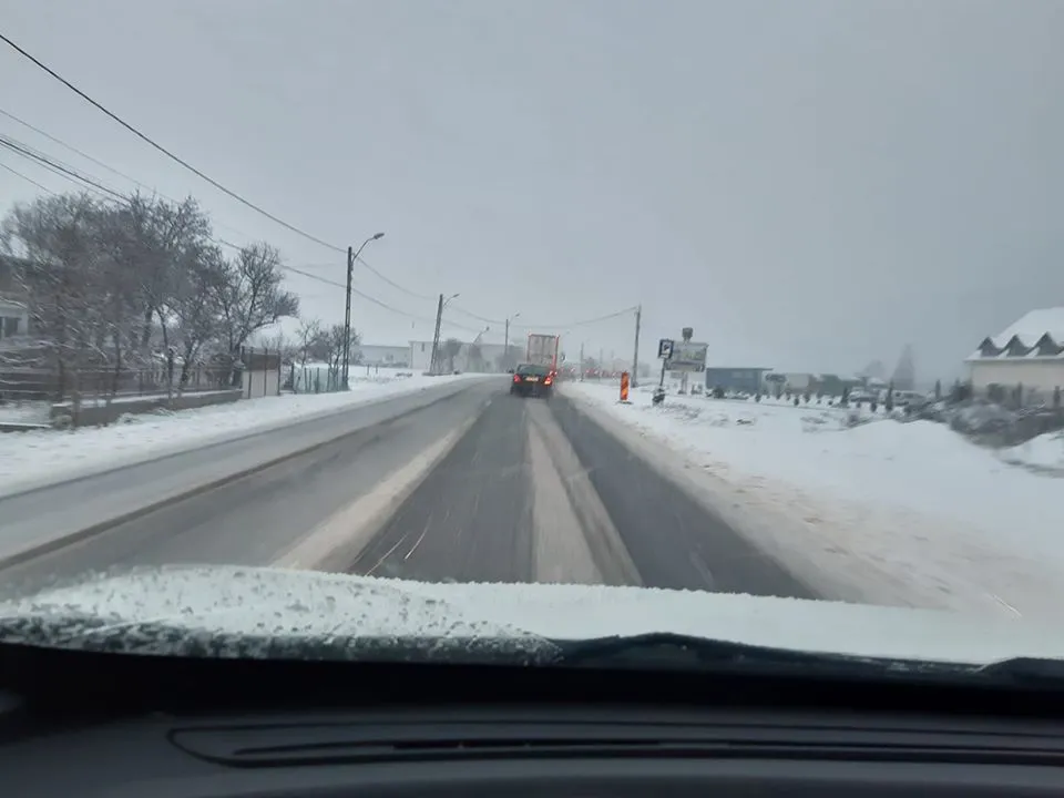 La ieșire din Cluj spre Oradea, în zona Negreni, zăpada s-a depus pe drumul Național.
