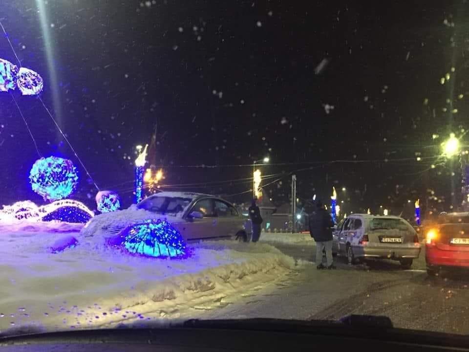 Zăpada de pe carosabil dublată viteză l-a făcut pe un șofer să aterizeze în sensul giratoriu din Florești.