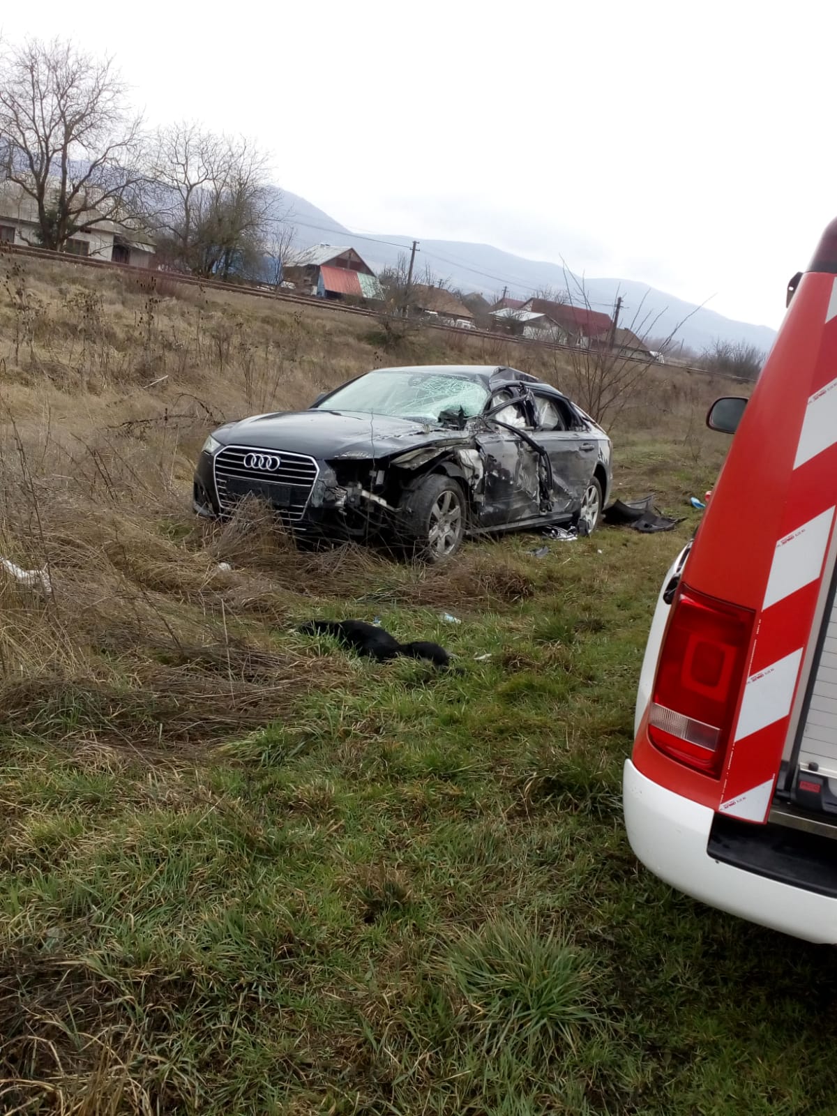 Audi proiectat pe câmp de un autotren care a depășit în curbă - FOTO