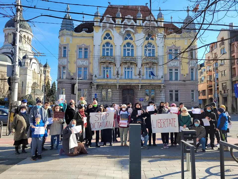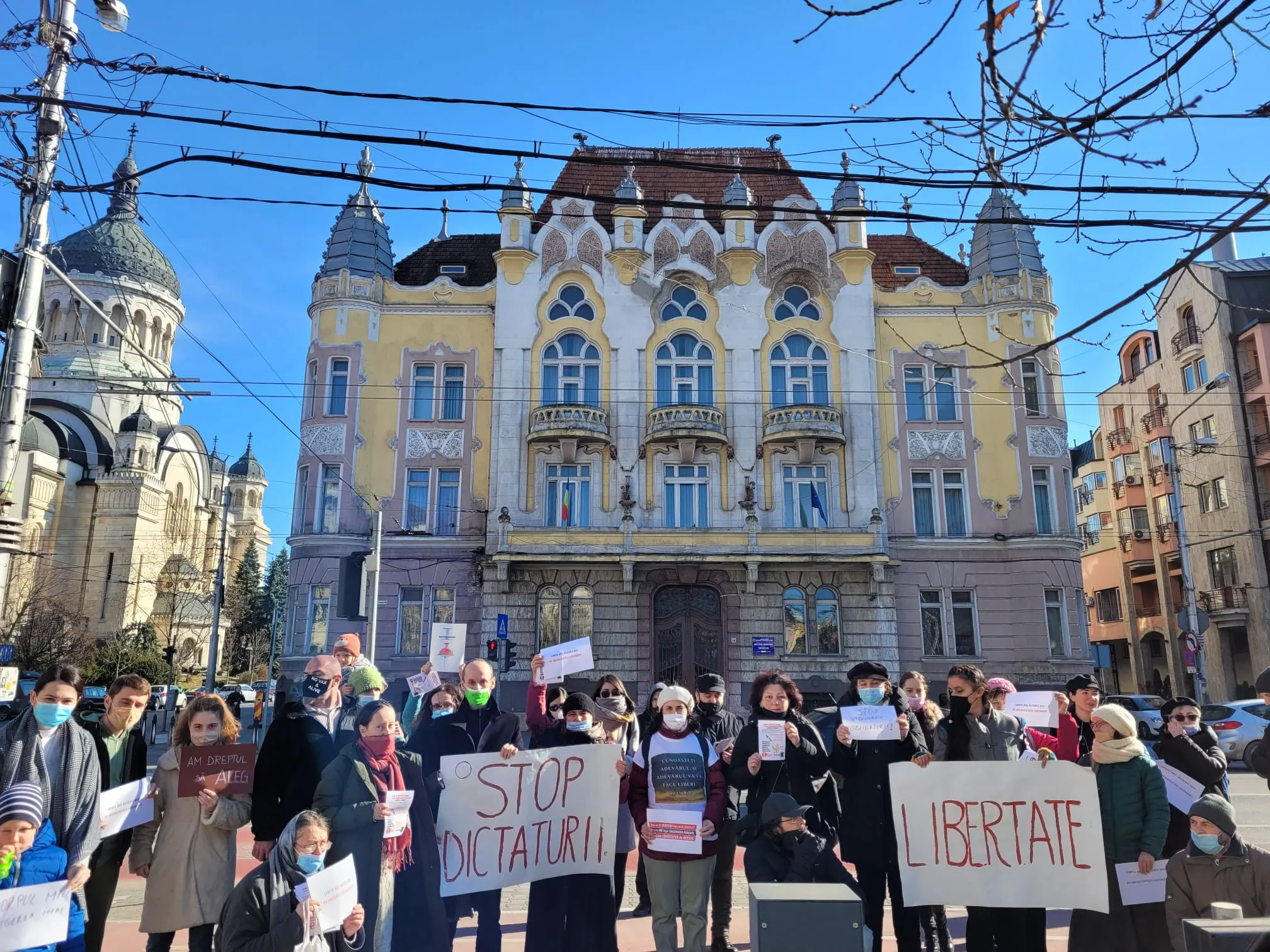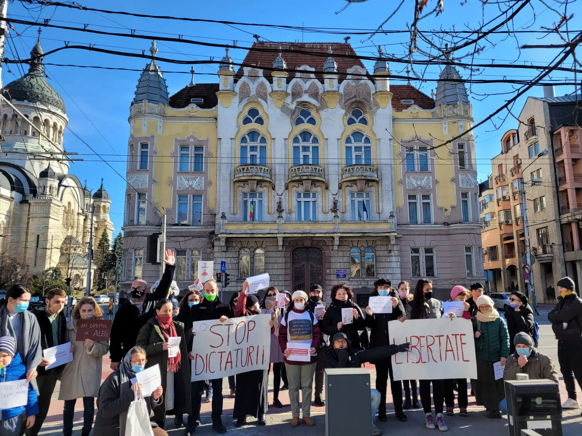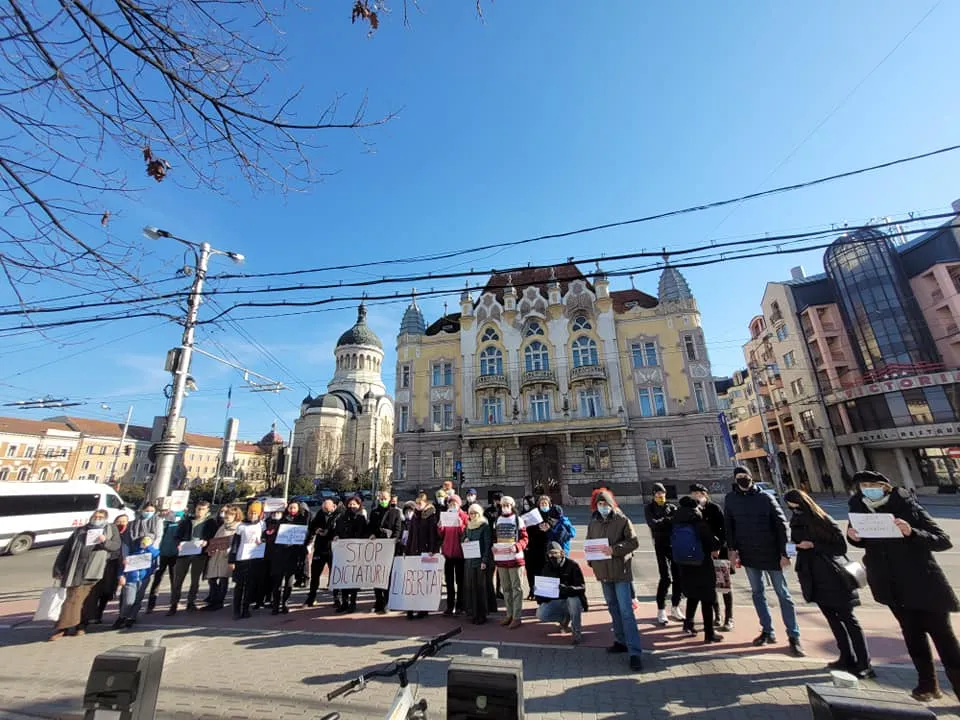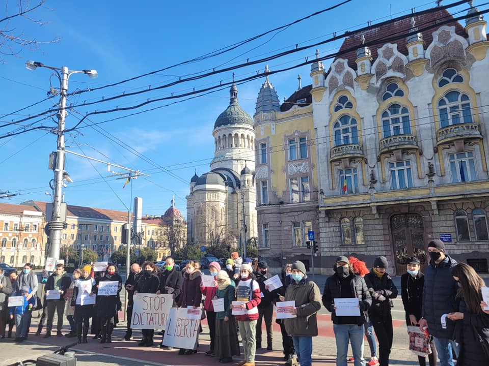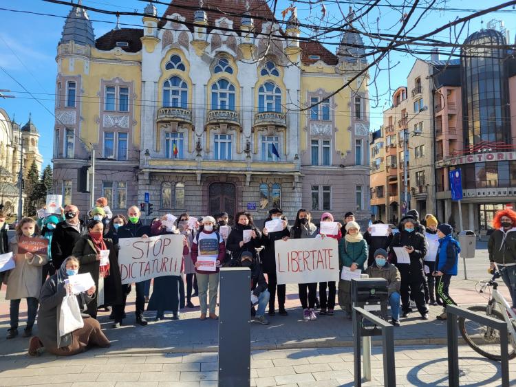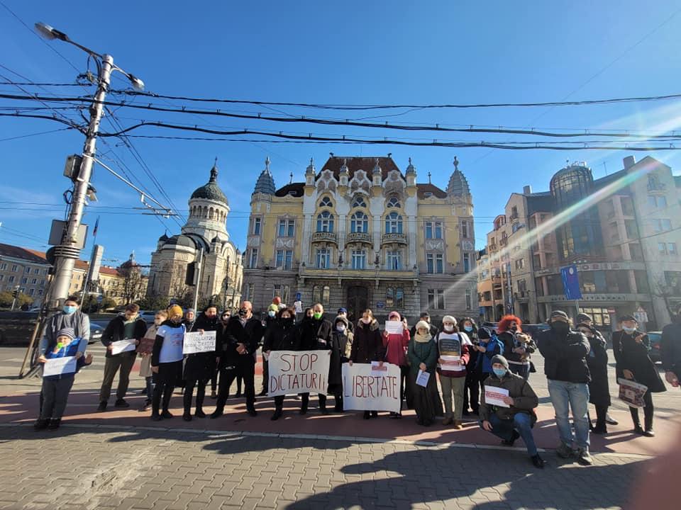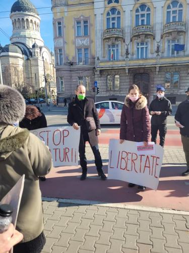 ”Stop dictaturii”, ”Libertate”, au scris membrii AUR pe pancartele afișate. Protestul a fost organizat de deputatul AUR, Ilie-Alin Colesa.