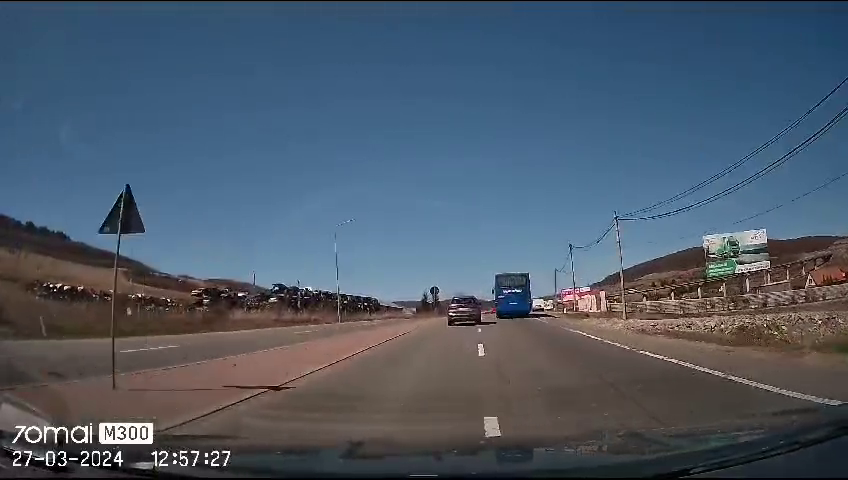 Probabil că șoferul autocarului are un program de respectat, iar dacă întârzie este penalizat. Numai așa se explică această manevră periculoasă, cu ajutorul căreia a mai câștigat un minut la drum.
