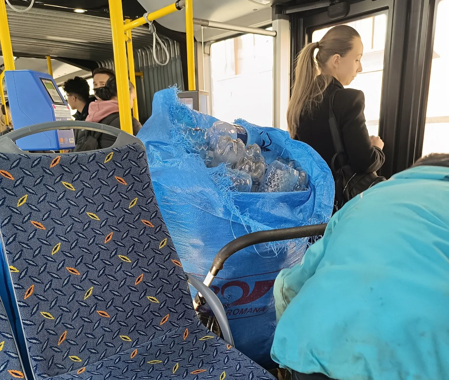 Autobuzele din Cluj, invadate de „reciclatori”! Clujenii se plâng că nu mai au loc de sacii plini cu PET-uri: „Amenință călătorii că le trage palme”