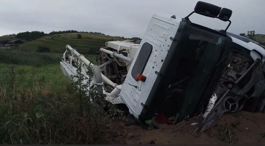 Un autocamion a ieșit în afara carosabilului și s-a răsturnat, oprindu-se într-un dâmb de pământ. Șoferul a fost evaluat de medicii care au ajuns la fața locului, dar a refuzat deplasarea la spital.
