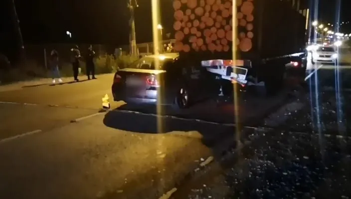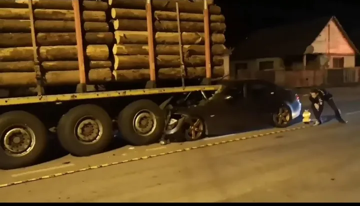 Un autoturism a intrat sub un camion cu lemne la ieșire din Dej.