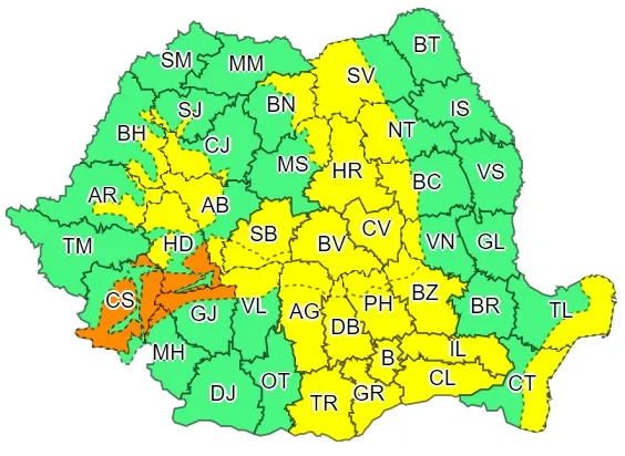 Meteorologii de la ANM au emis o nouă serie de avertismente de tip cod galben și portocaliu de vreme rea pentru mai multe județe din țară, printre care și Clujul.