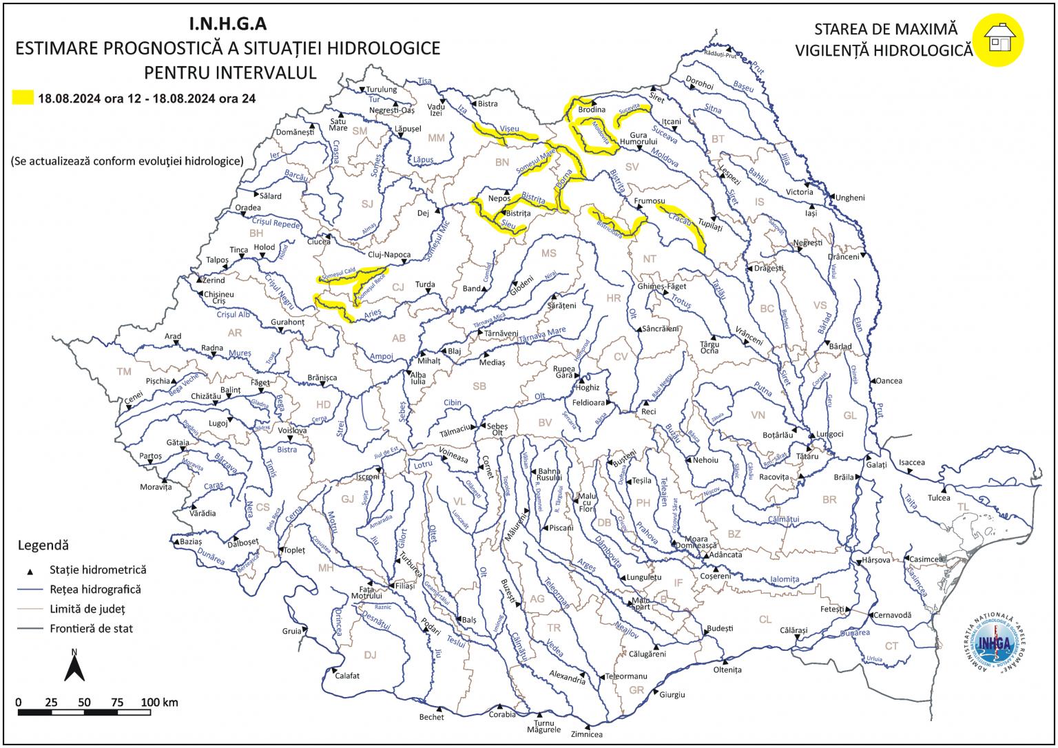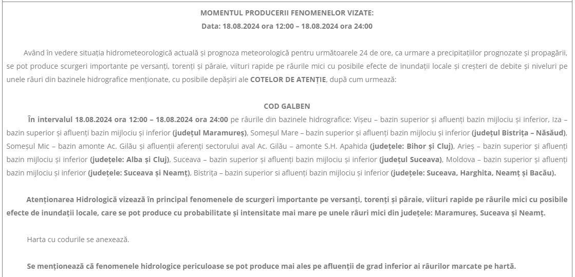 ” În intervalul 18.08.2024 ora 12:00 – 18.08.2024 ora 24:00 pe râurile din bazinele hidrografice: Vişeu – bazin superior şi afluenţi bazin mijlociu şi inferior, Iza – bazin superior şi afluenţi bazin mijlociu şi inferior (judeţul Maramureş), Someşul Mare – bazin superior şi afluenţi bazin mijlociu şi inferior (judeţul Bistriţa – Năsăud), Someşul Mic – bazin amonte Ac. Gilău şi afluenţii aferenţi sectorului aval Ac. Gilău – amonte S.H. Apahida (judeţele: Bihor şi Cluj), Arieş – bazin superior şi afluenţi bazin mijlociu şi inferior (judeţele: Alba şi Cluj), Suceava – bazin superior şi afluenţi bazin mijlociu şi inferior (judeţul Suceava), Moldova – bazin superior şi afluenţi bazin mijlociu şi inferior (judeţele: Suceava şi Neamţ), Bistriţa – bazin superior si afluenţi bazin mijlociu şi inferior (judeţele: Suceava, Harghita, Neamţ şi Bacău).” se arată în comunicatul Institutului de Hidrologie.