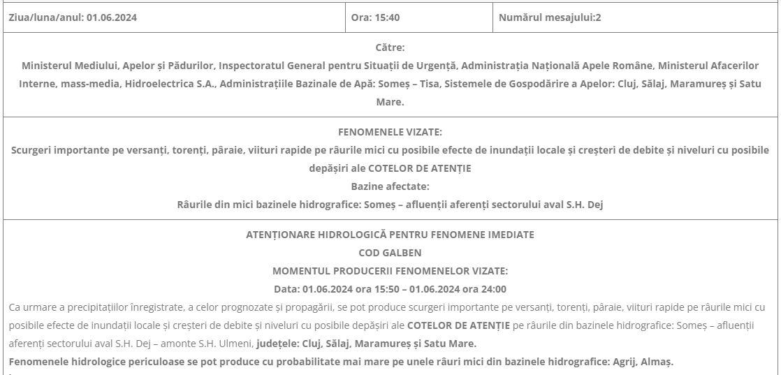 ”Ca urmare a precipitațiilor înregistrate, a celor prognozate și propagării, se pot produce scurgeri importante pe versanți, torenți, pâraie, viituri rapide pe râurile mici cu posibile efecte de inundații locale și creșteri de debite și niveluri cu posibile depășiri ale COTELOR DE ATENŢIE pe râurile din bazinele hidrografice: Someș – afluenții aferenți sectorului aval S.H. Dej – amonte S.H. Ulmeni, județele: Cluj, Sălaj, Maramureș și Satu Mare.