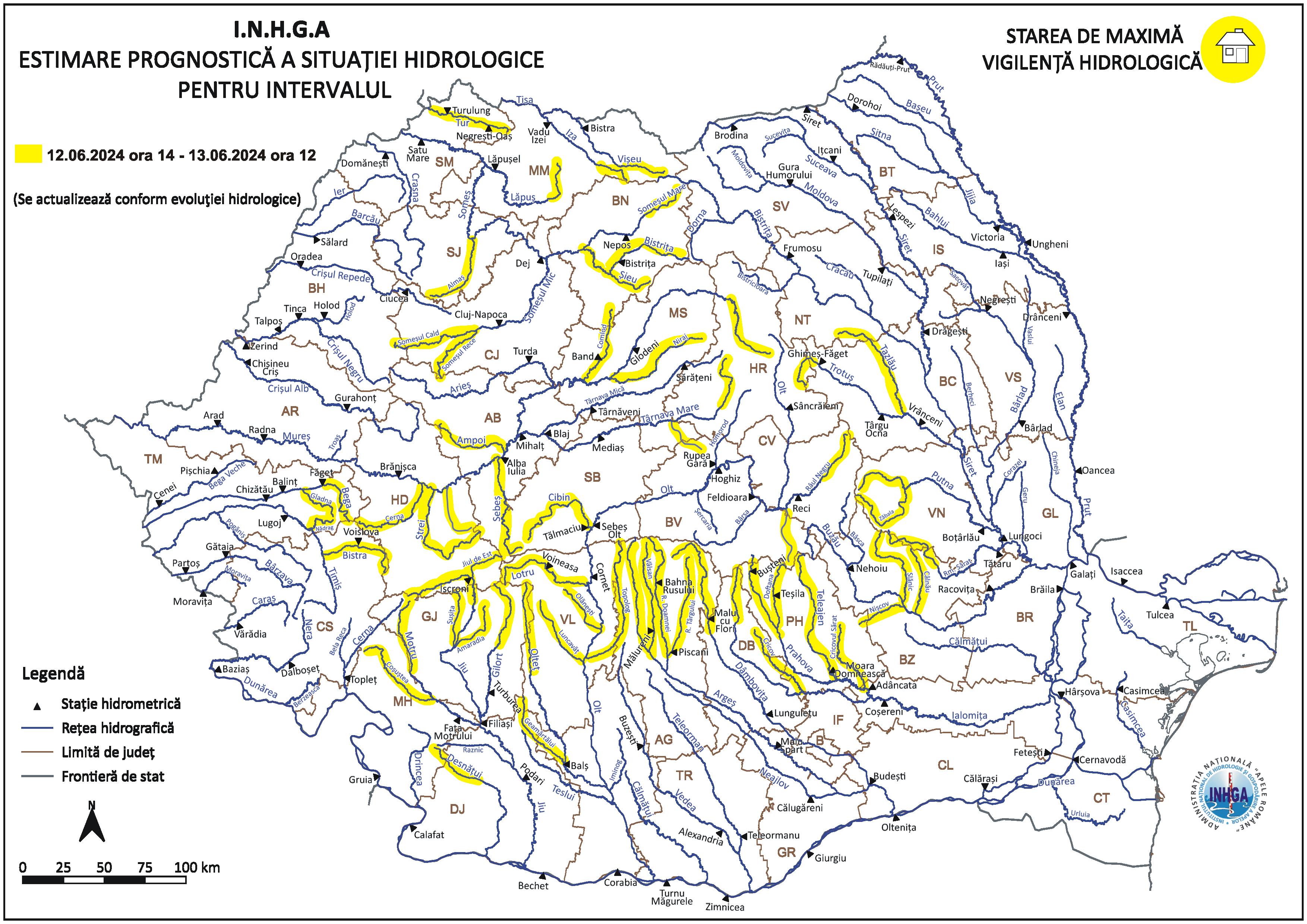 Atenționarea va fi valabilă în intervalul 12.06.2024 ora 14:00 – 13.06.2024 ora 12:00, timp în care se pot produce scurgeri importante pe versanţi, torenţi şi pâraie, viituri rapide pe râurile mici cu posibile efecte de inundaţii locale şi creşteri de debite şi niveluri pe unele râuri din bazinele hidrografice menţionate, cu posibile depăşiri ale Cotelor de Atenție.
