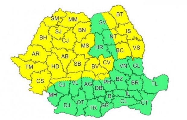 În jumătatea vestică a teritoriului vor fi averse, iar cantitățile de apă vor depăși pe arii restrânse 15...20 l/mp.