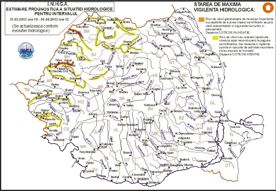 Institutul Național de Hidrologie și Gospodărire a Apelor a emis o avertizare în care precizează că se prelungește codul galben de inundașăă până luni, 01 aprilie, la ora 12.00.