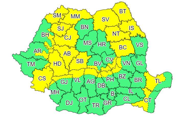 Potrivit ANM, joi, în intervalul 12:00 – 23:00, în zonele montane, local în Moldova, Transilvania, Maramureș, sudul Banatului și în zona continentală a Dobrogei va fi Cod Galben de instabilitate atmosferică.
