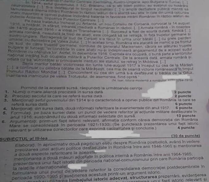 În spațiul public au apărut imagini cu subiectele de la Istorie. Potrivit imaginilor, la Subiectul III, elevii au de făcut un eseu despre România postbelică.