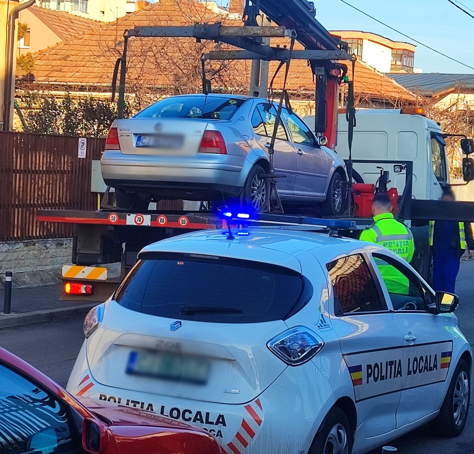 „Băieții” de ridicări auto, însoțiti de Poliția Locală, a acționat prompt, respectând regulamentele locale de parcare.