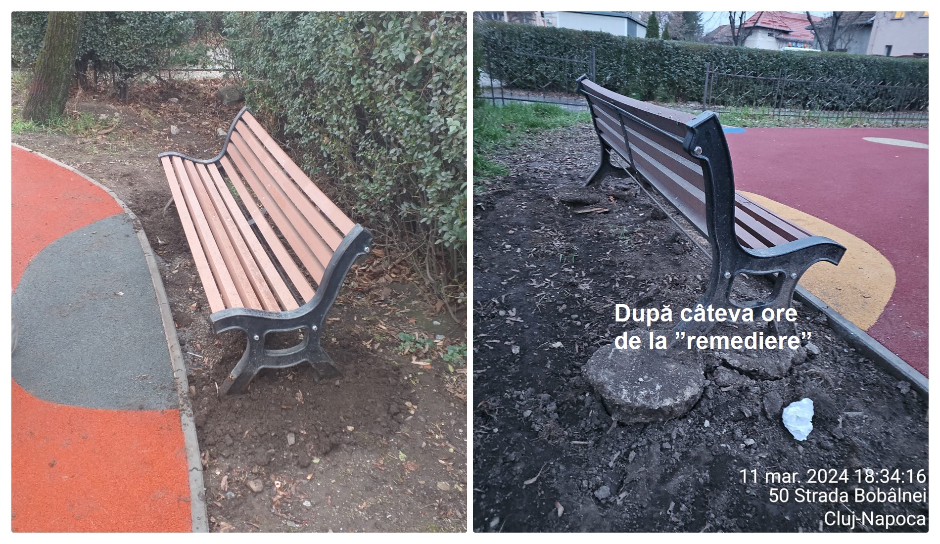 Ei bine, ”specialiștii” au ridicat puțin băncile și le-au îndreptat, considerând că așa s-a remediat doleanța unui părinte care reclamă calitatea lucrărilor. ”Băncile dn imagini au fost restabilizate. Au verificat cei de la Spații verzi zona respectivă și au rezolvat deficiențele constatate”, au precizat reprezentanții Biroului de Presă din cadrul Primăriei Cluj-Napoca.
