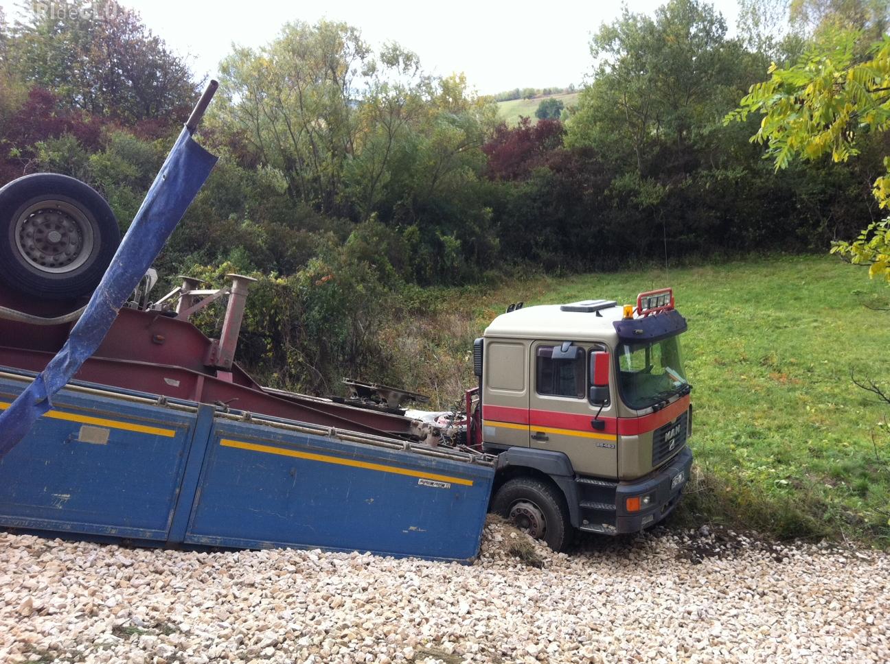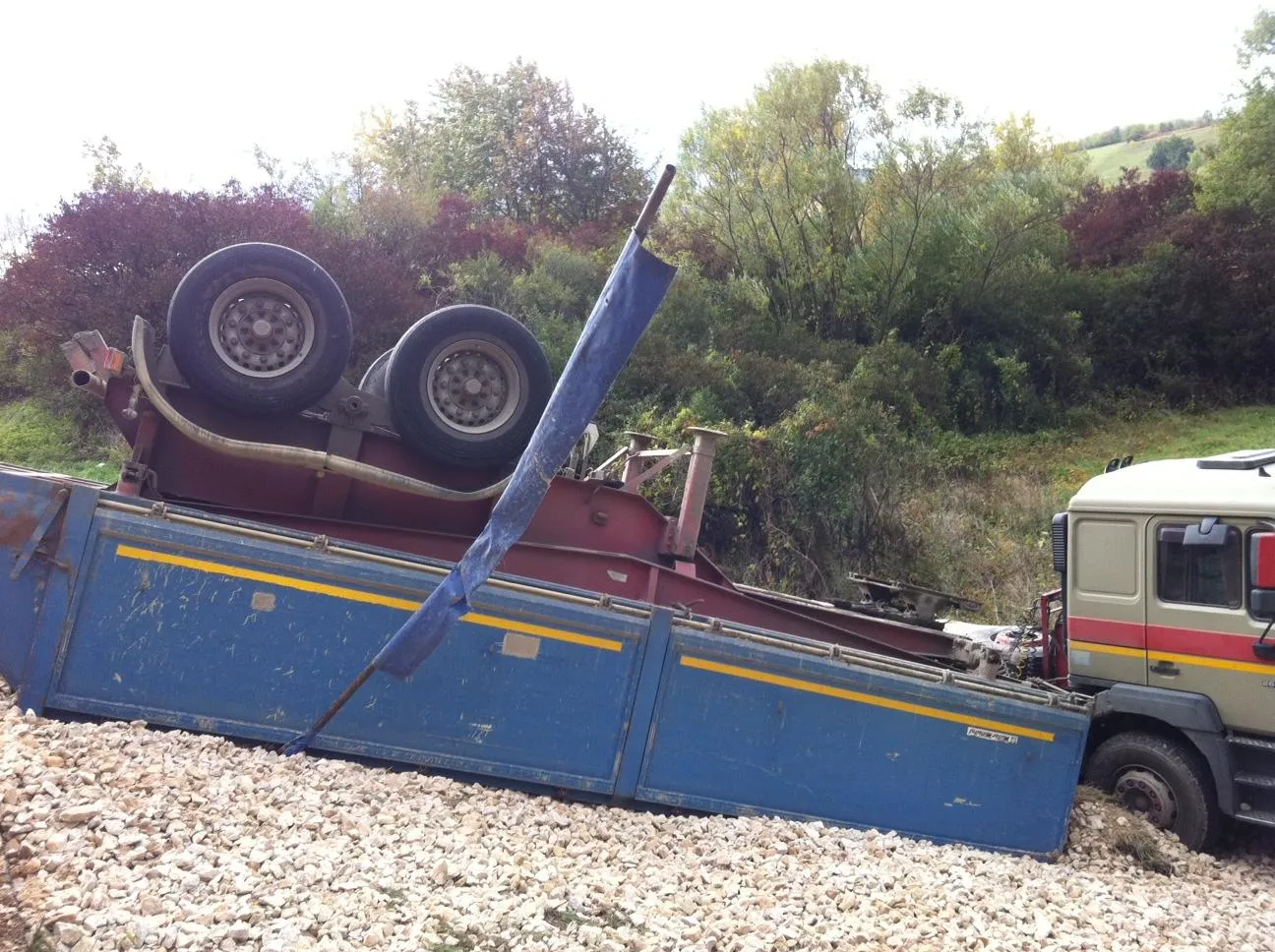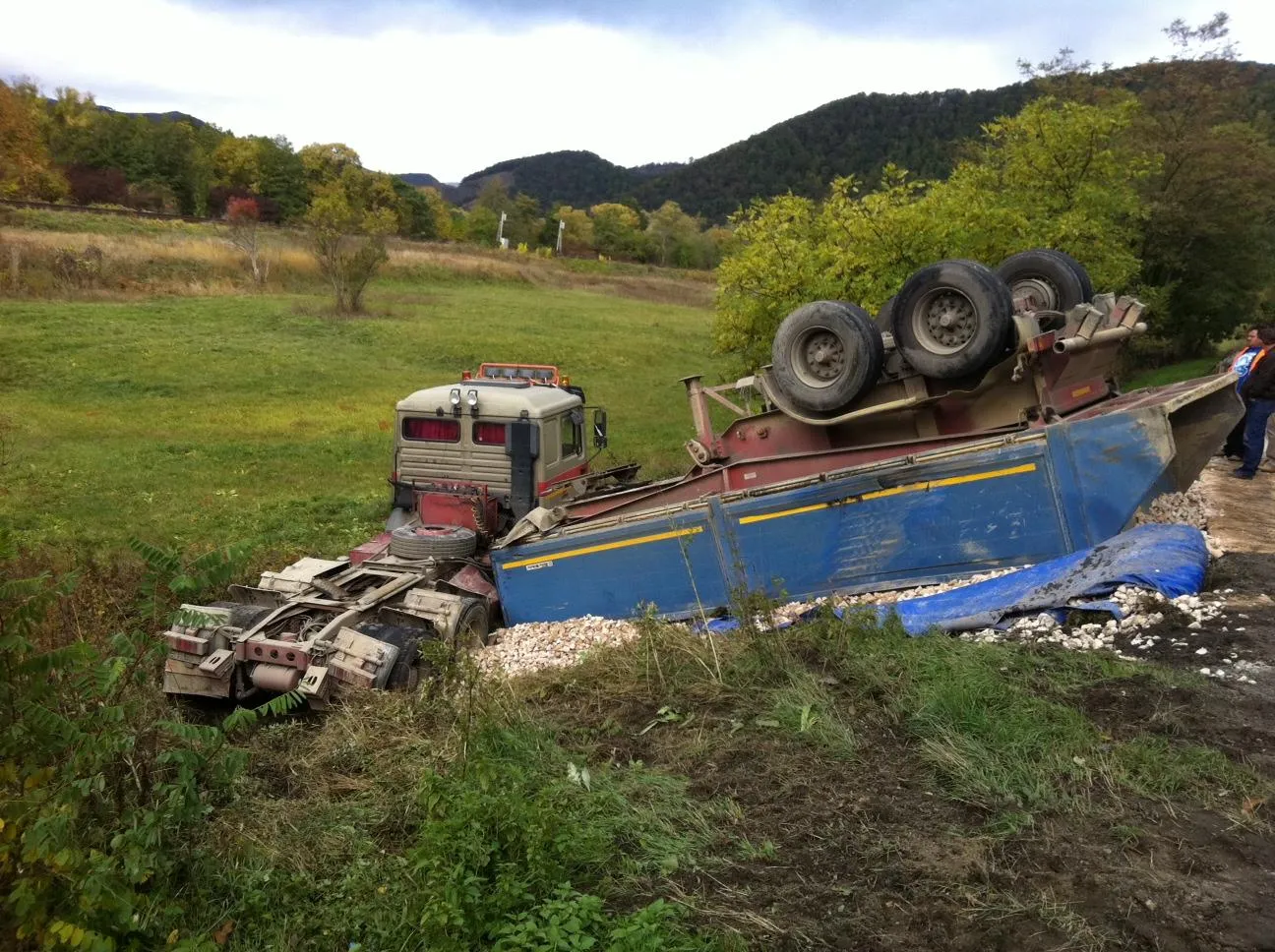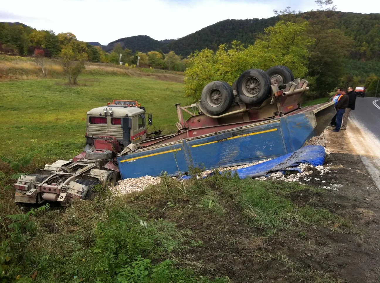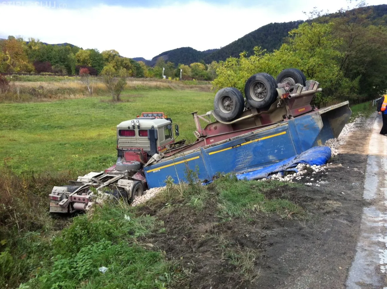 Basculanta a intrat în balans și s-a răsturnat pe marginea drumului.