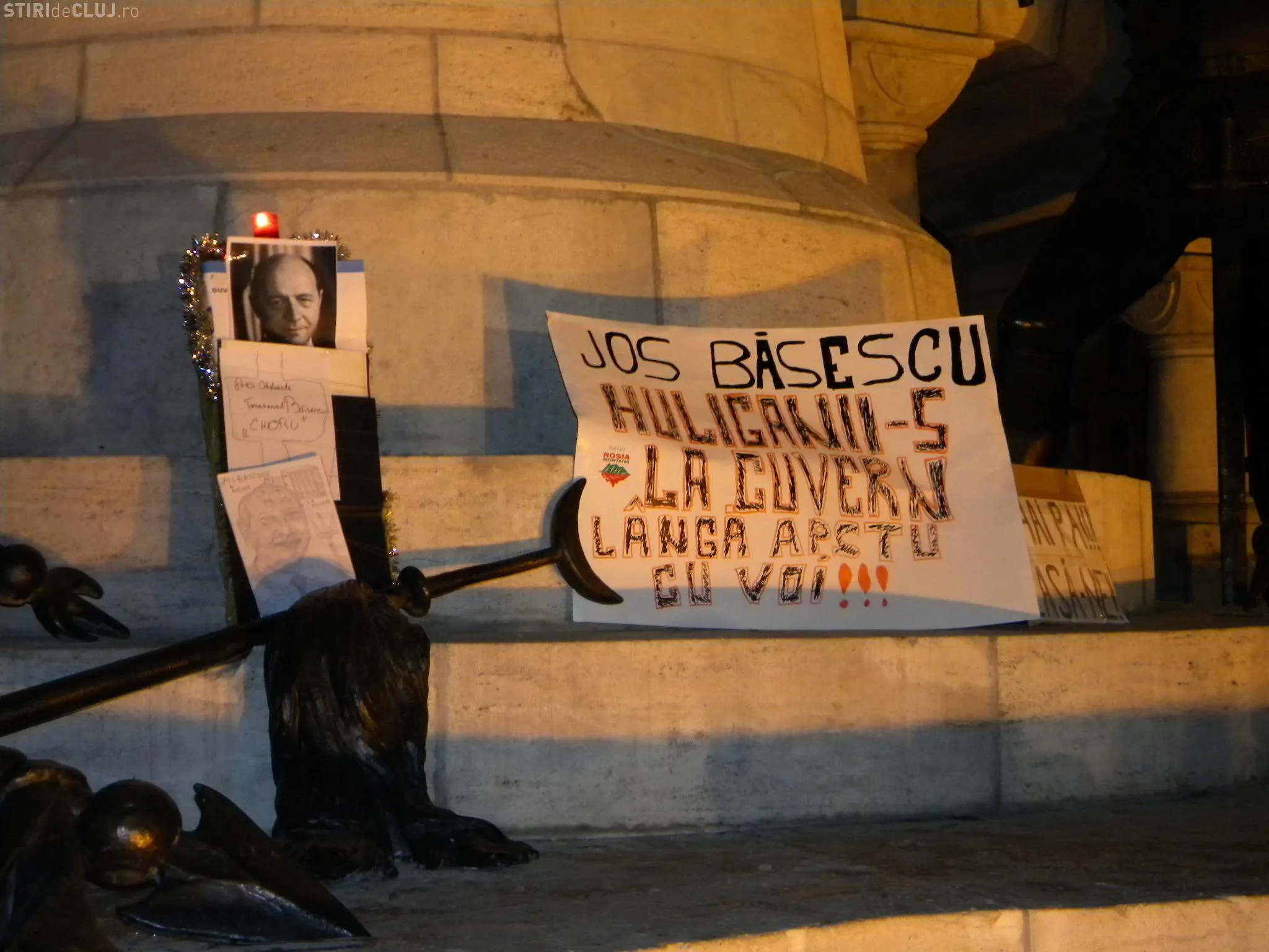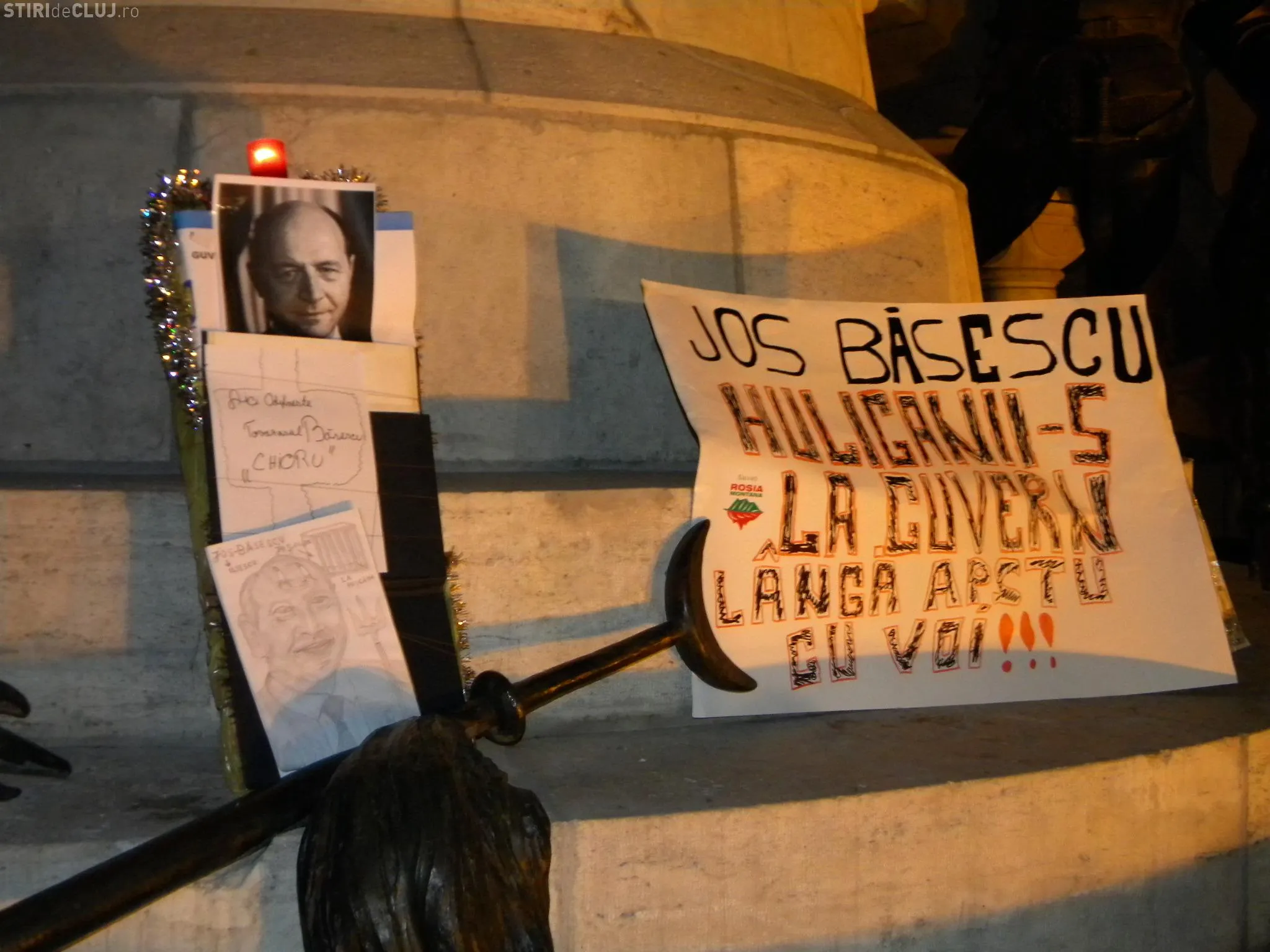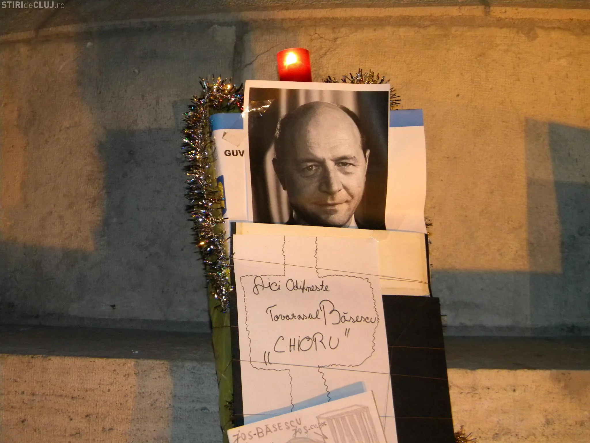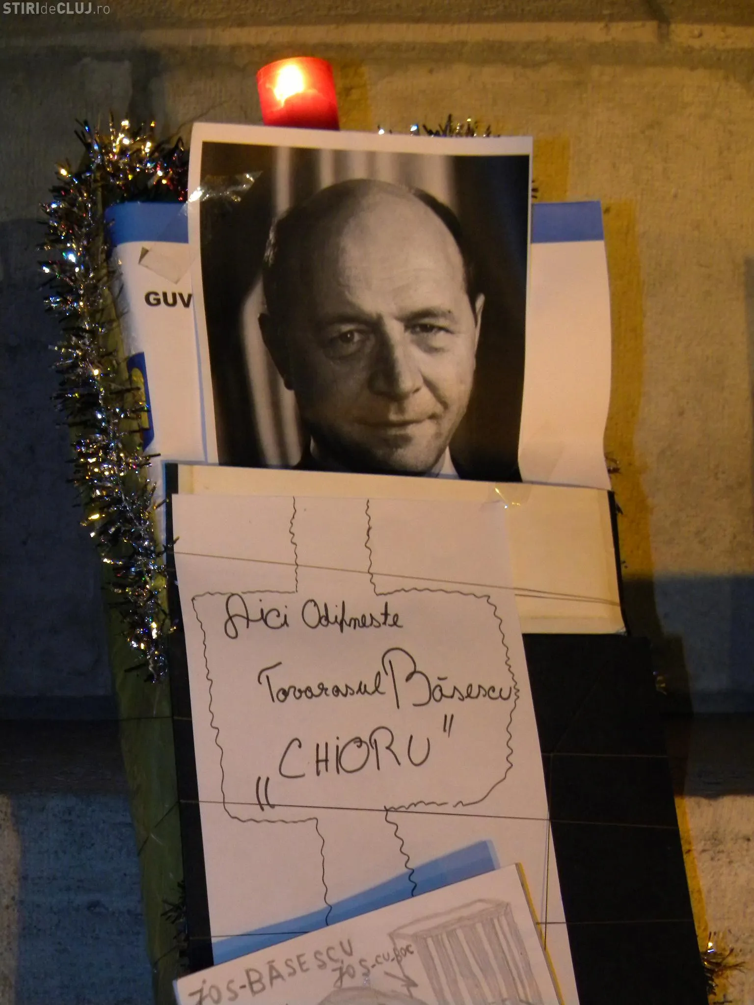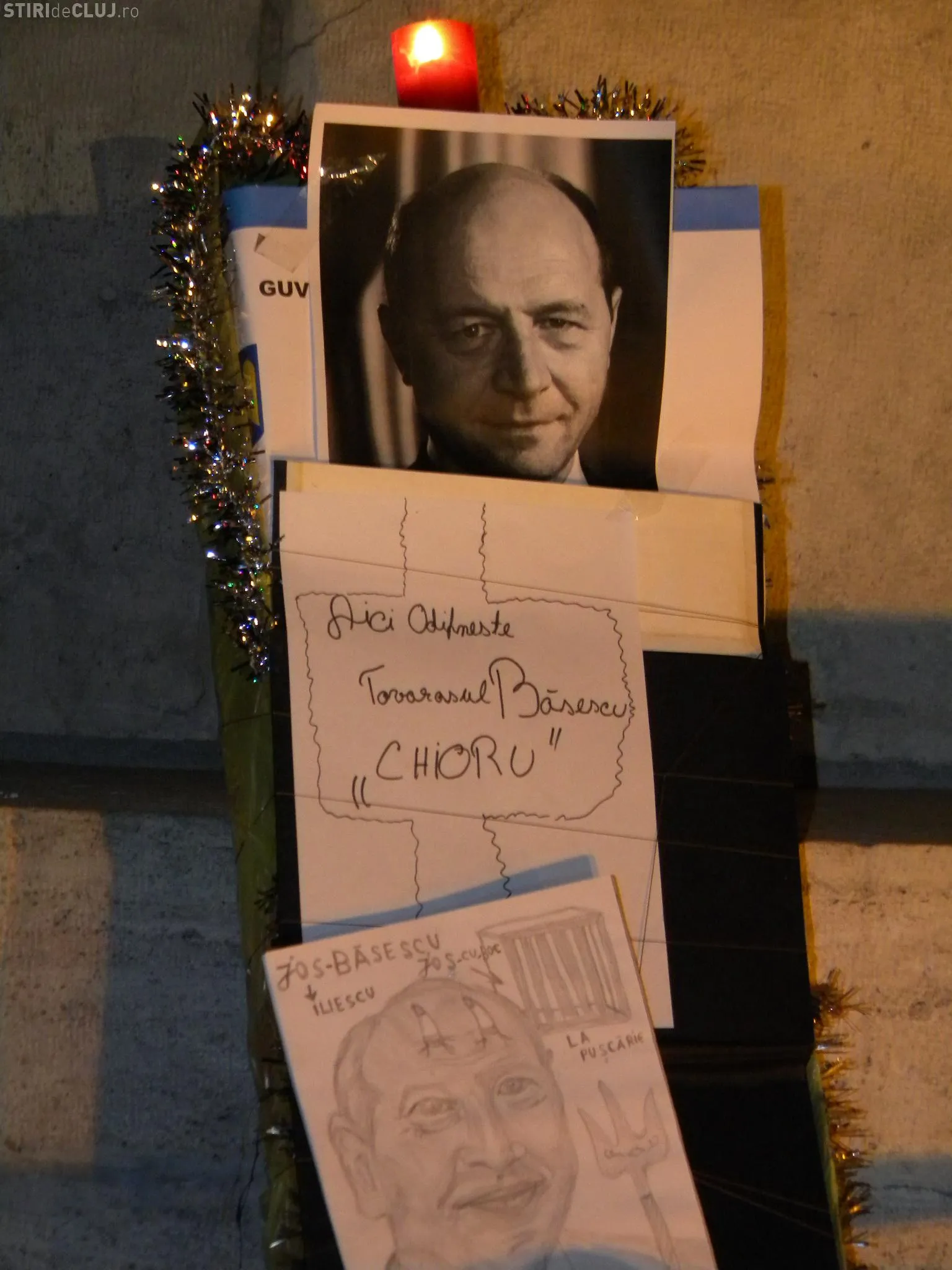 Basescu, ingropat la Cluj-Napoca! Poza presedintelui si o lumanare aprinsa in Piata Unirii de protestatari VIDEO si FOTO