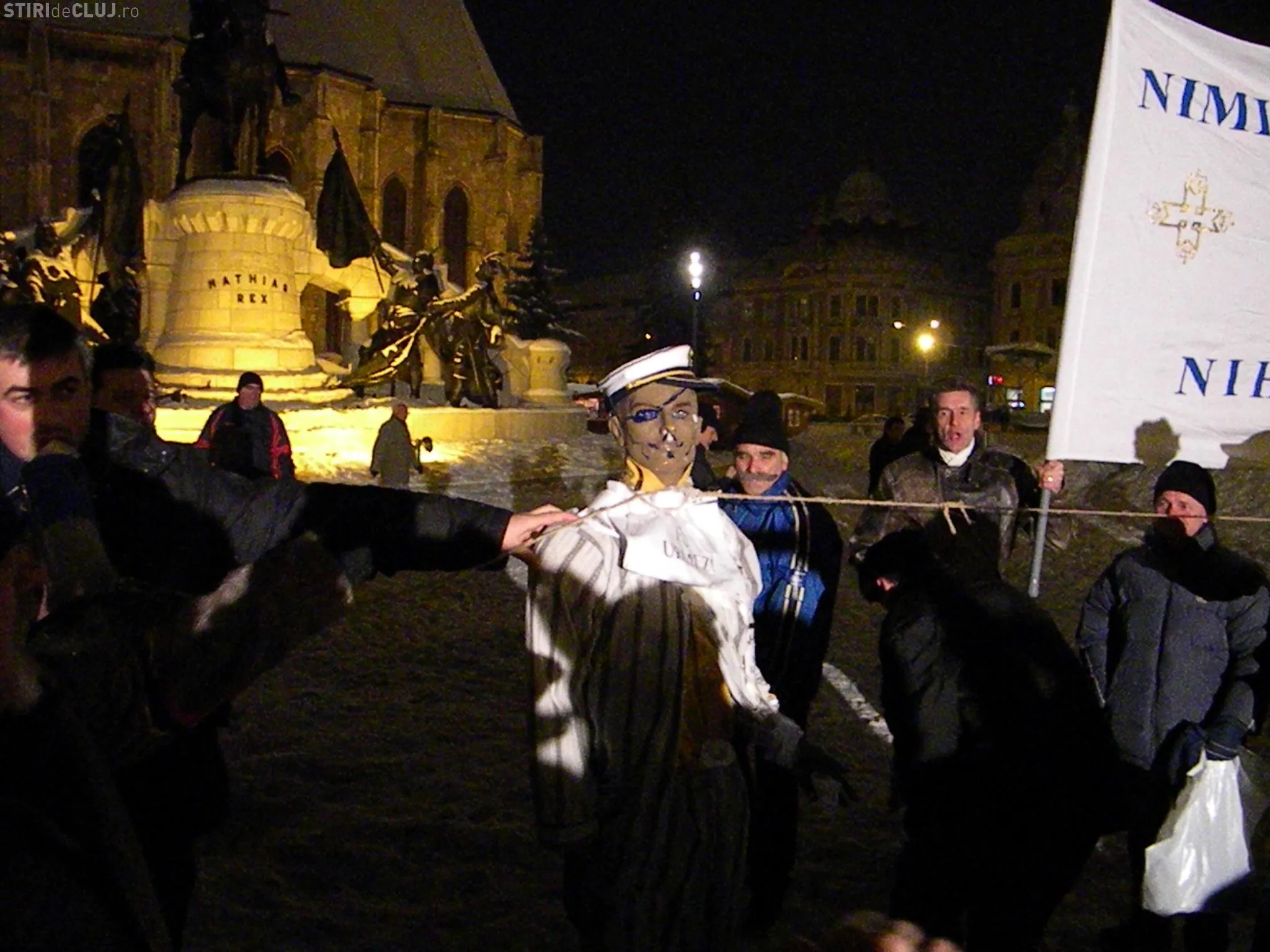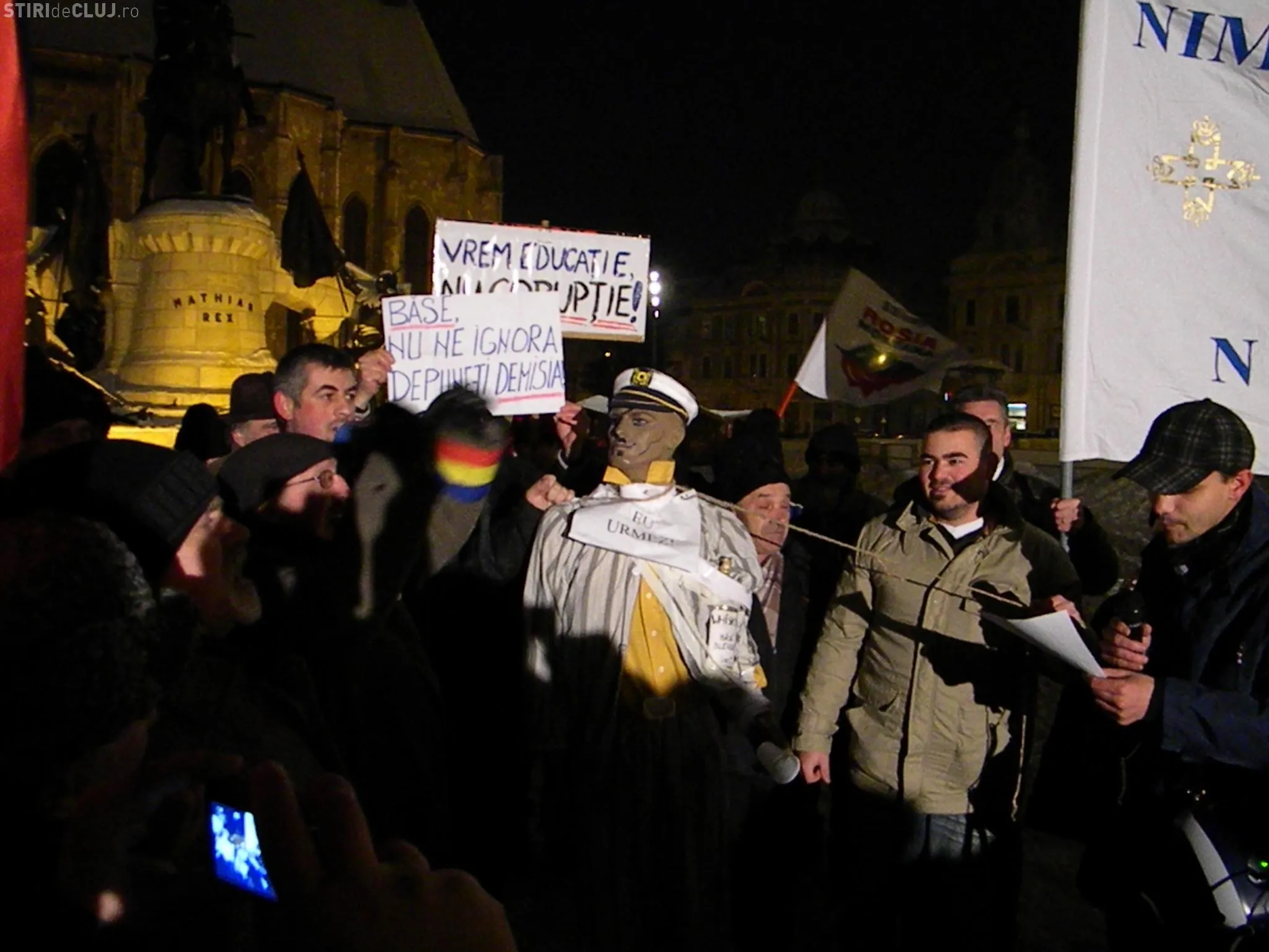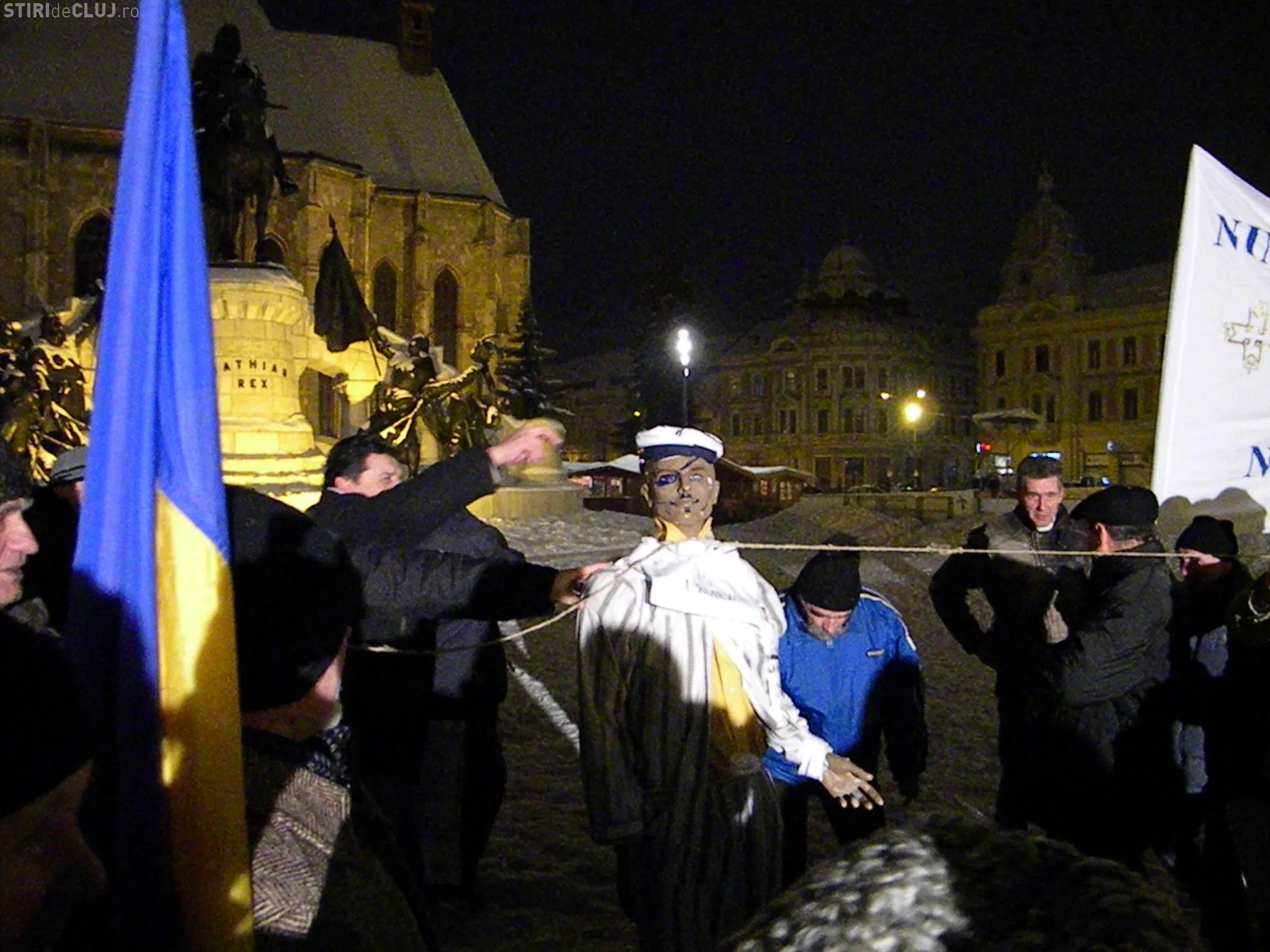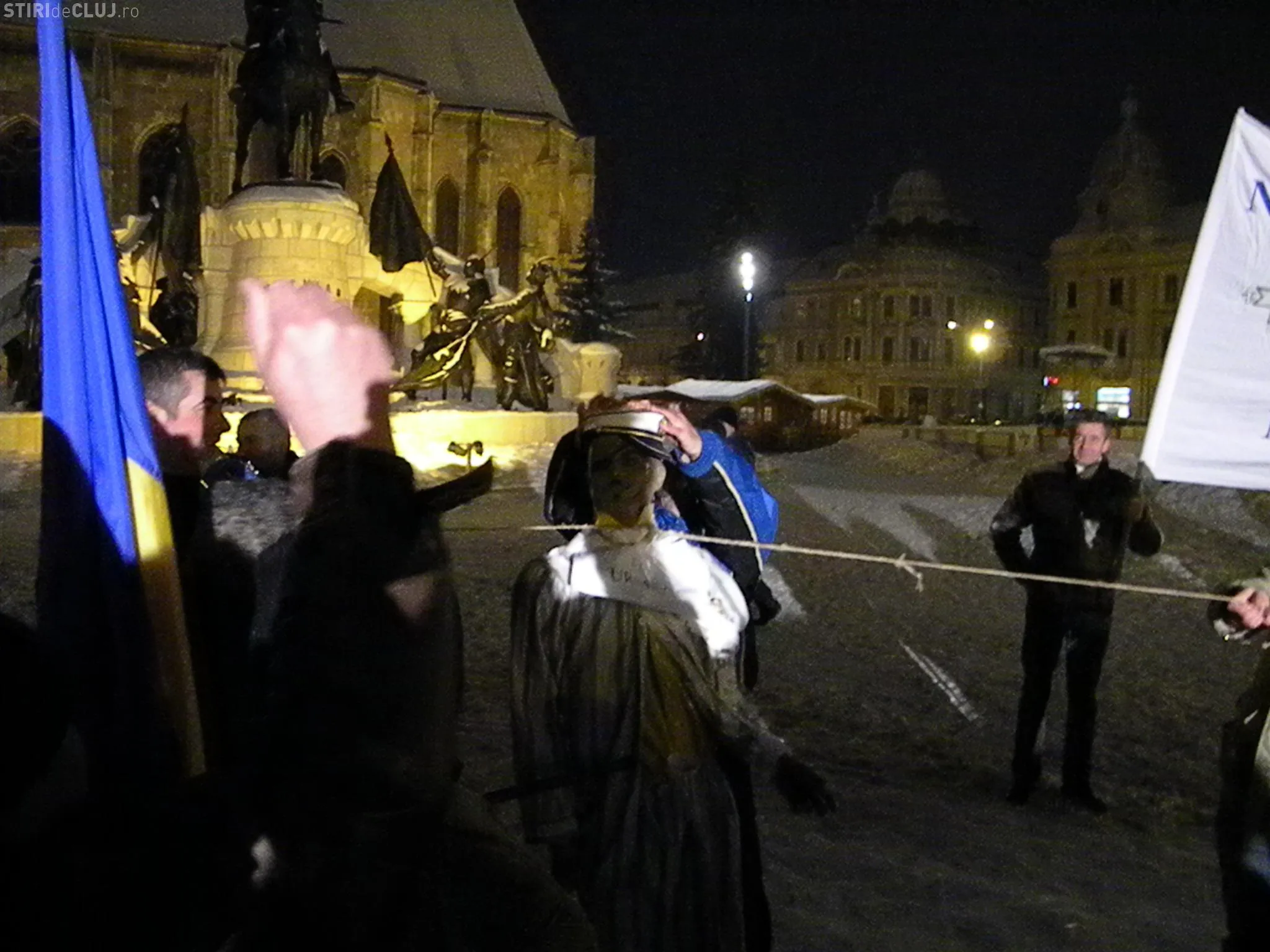 Dupa ce au expus manechinul, protestatarii l-au tarat pana la statuia Matei Corvin.