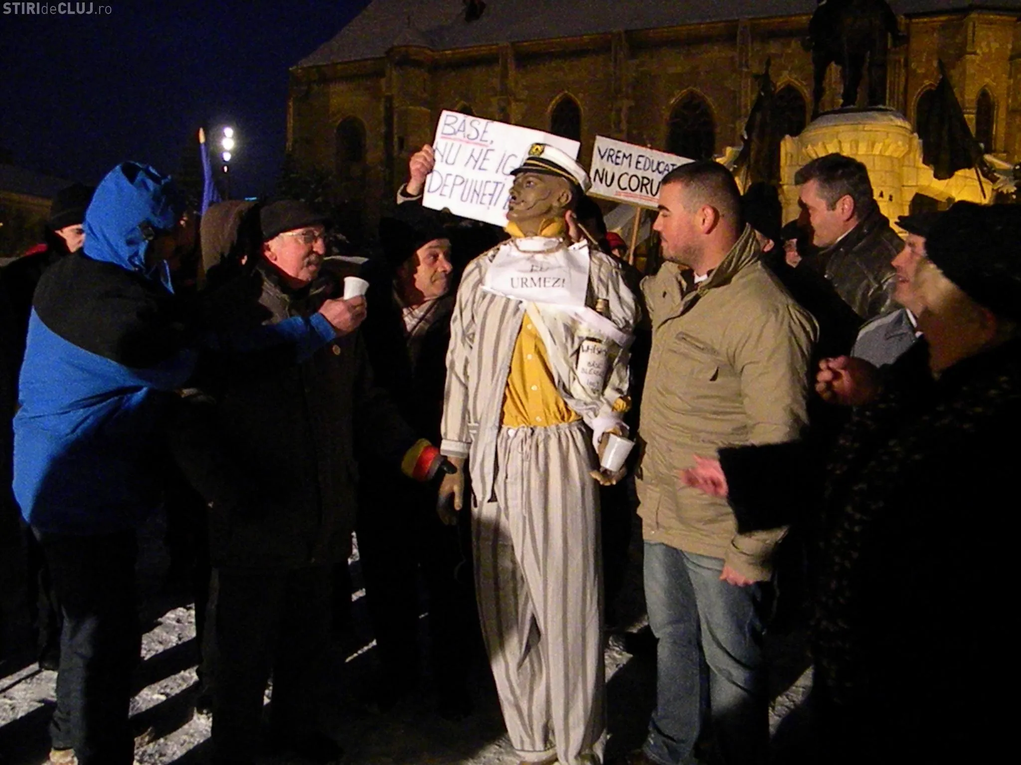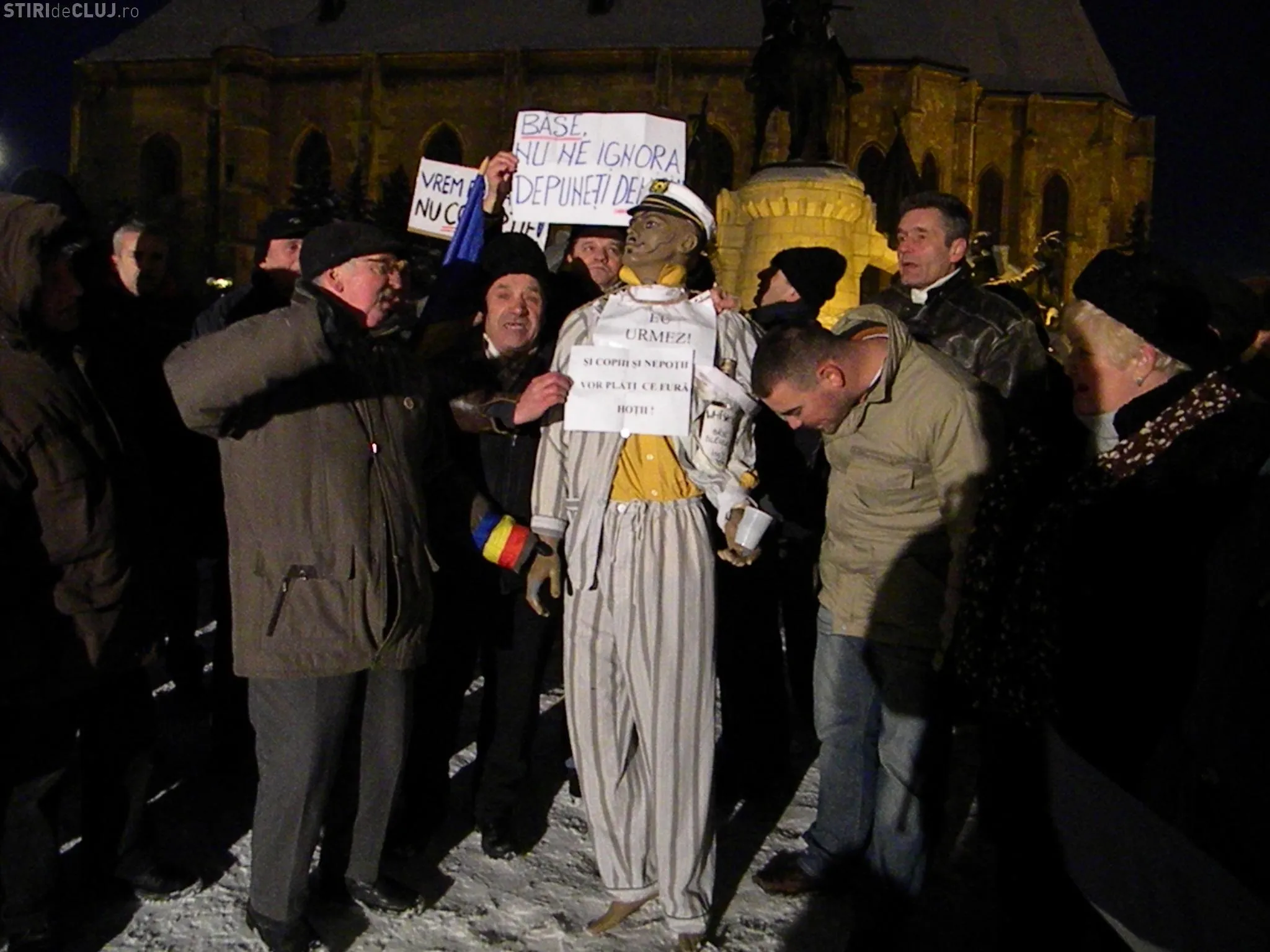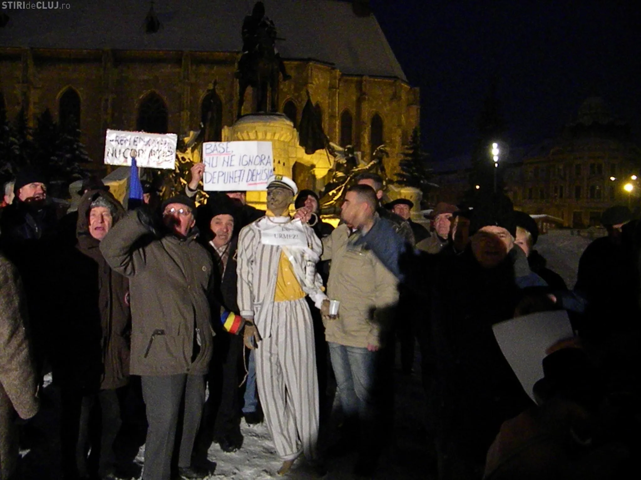 Dupa ce au expus manechinul, protestatarii l-au tarat pana la statuia Matei Corvin.