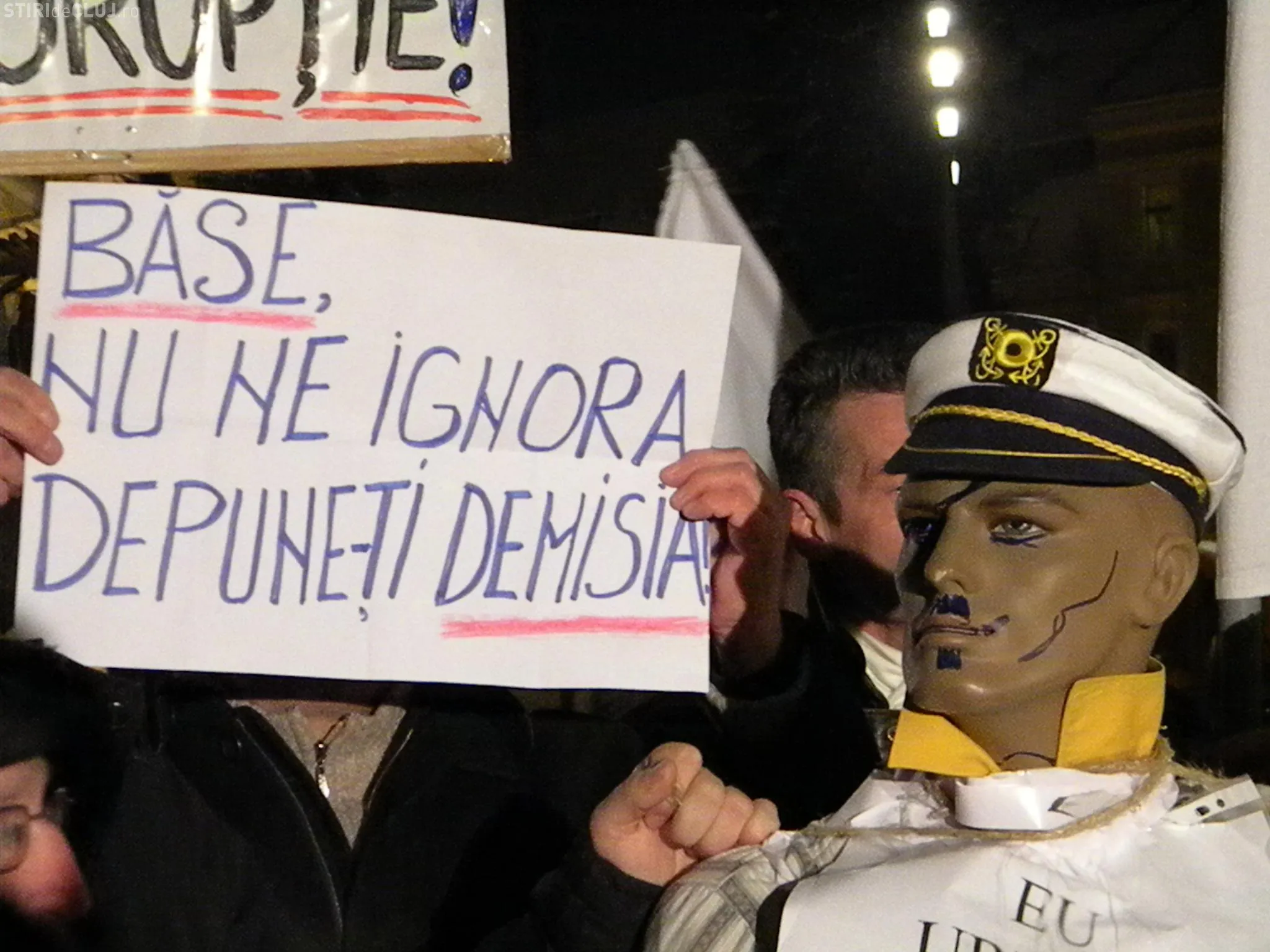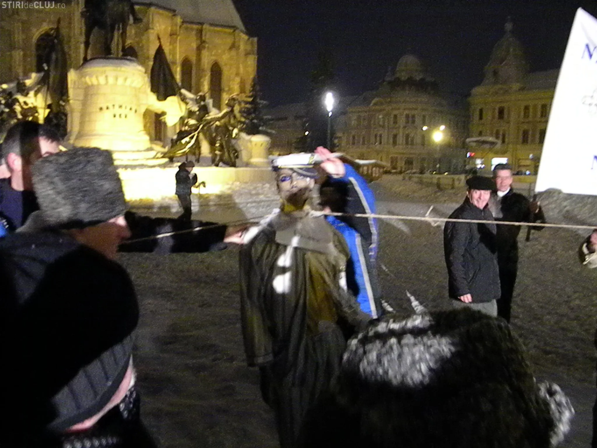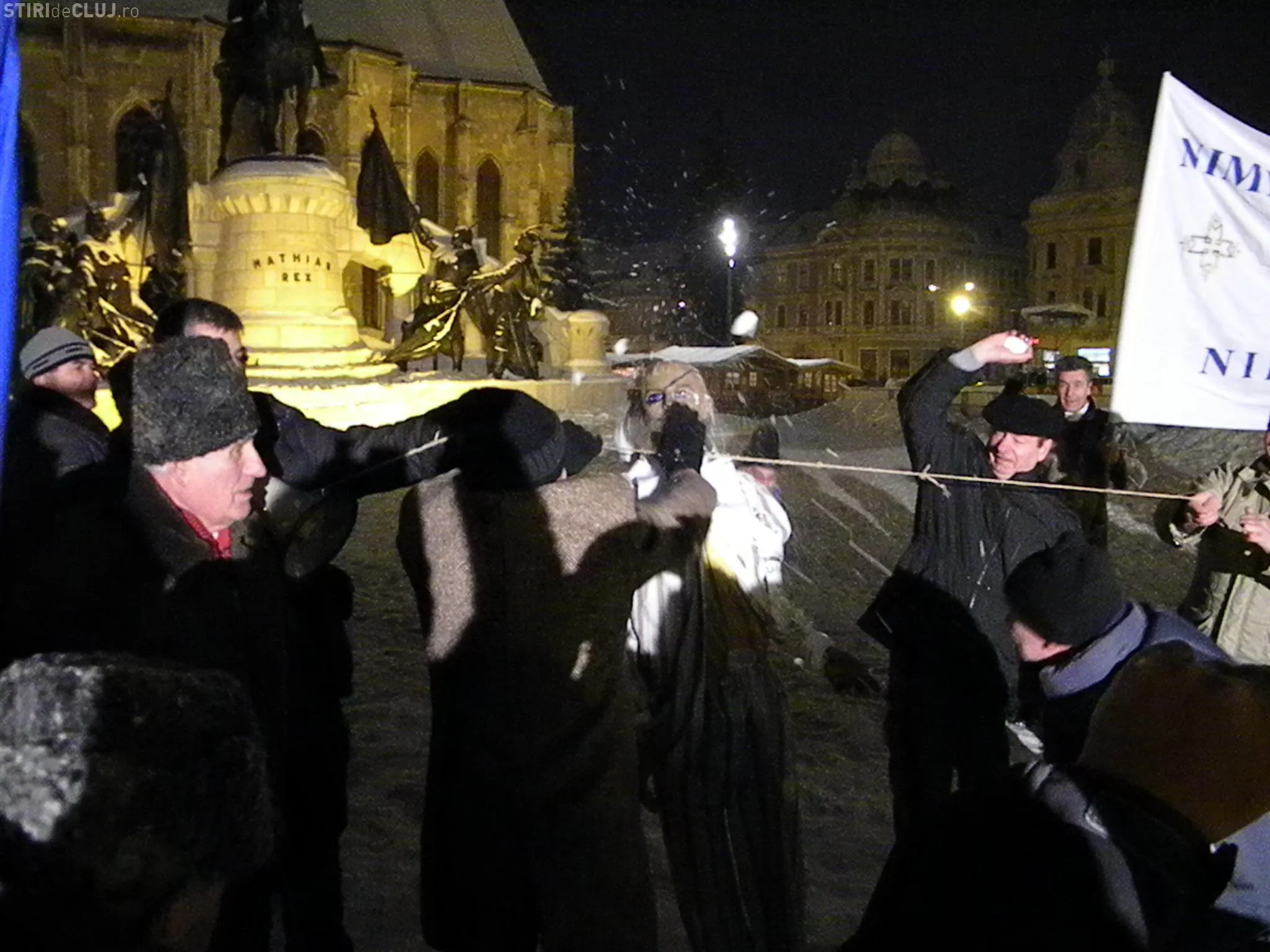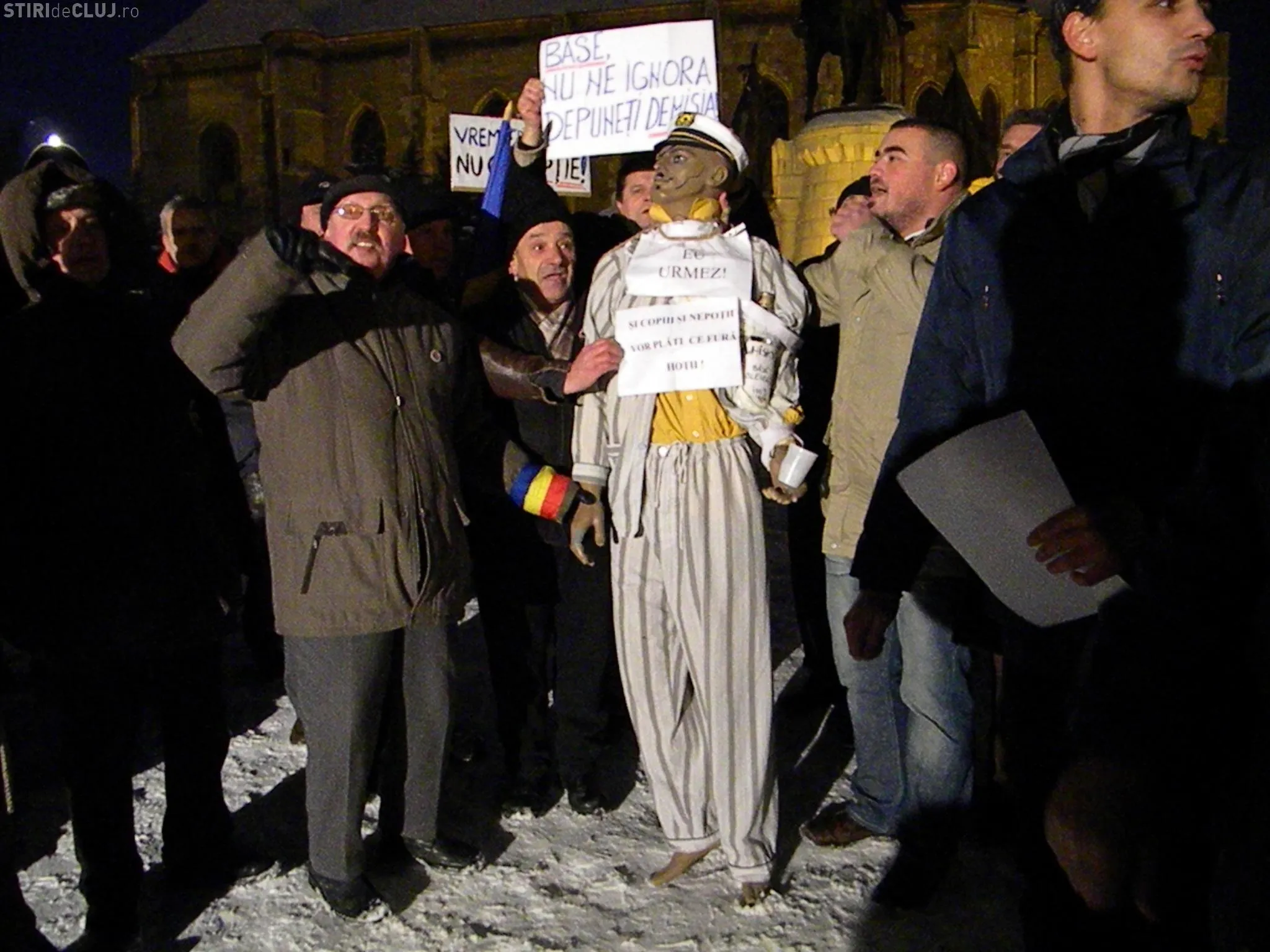 Dupa ce au expus manechinul, protestatarii l-au tarat pana la statuia Matei Corvin.