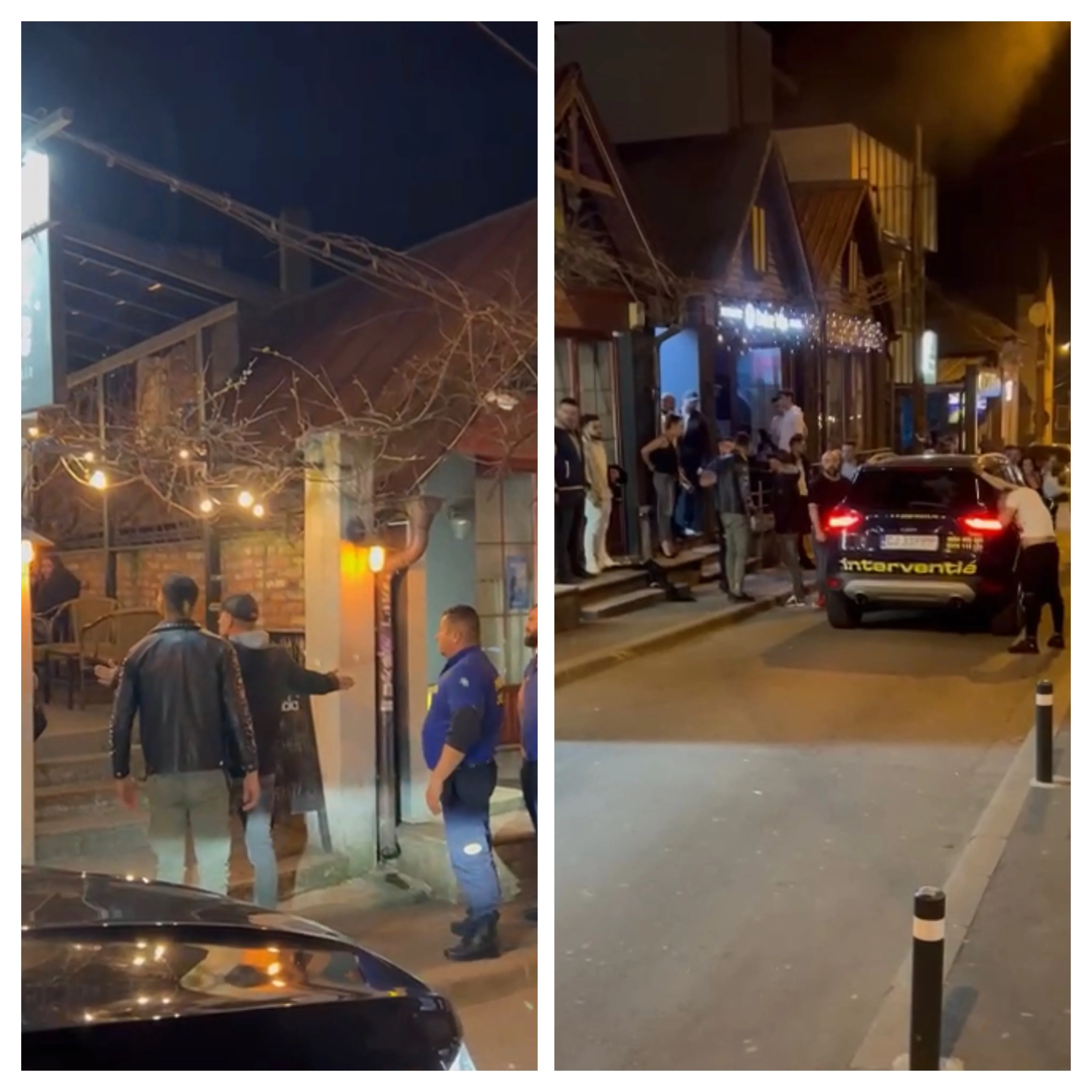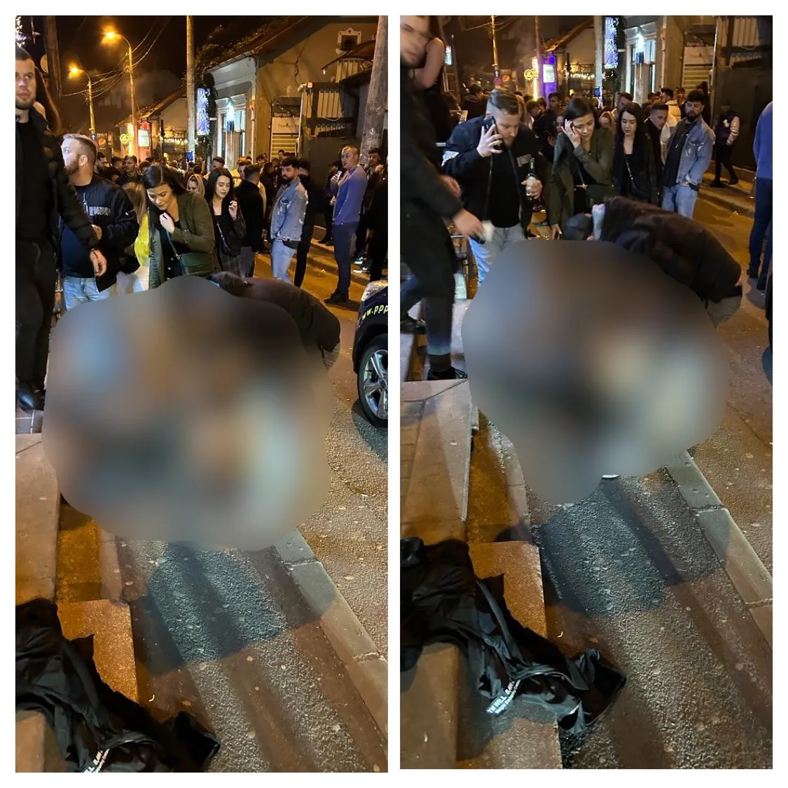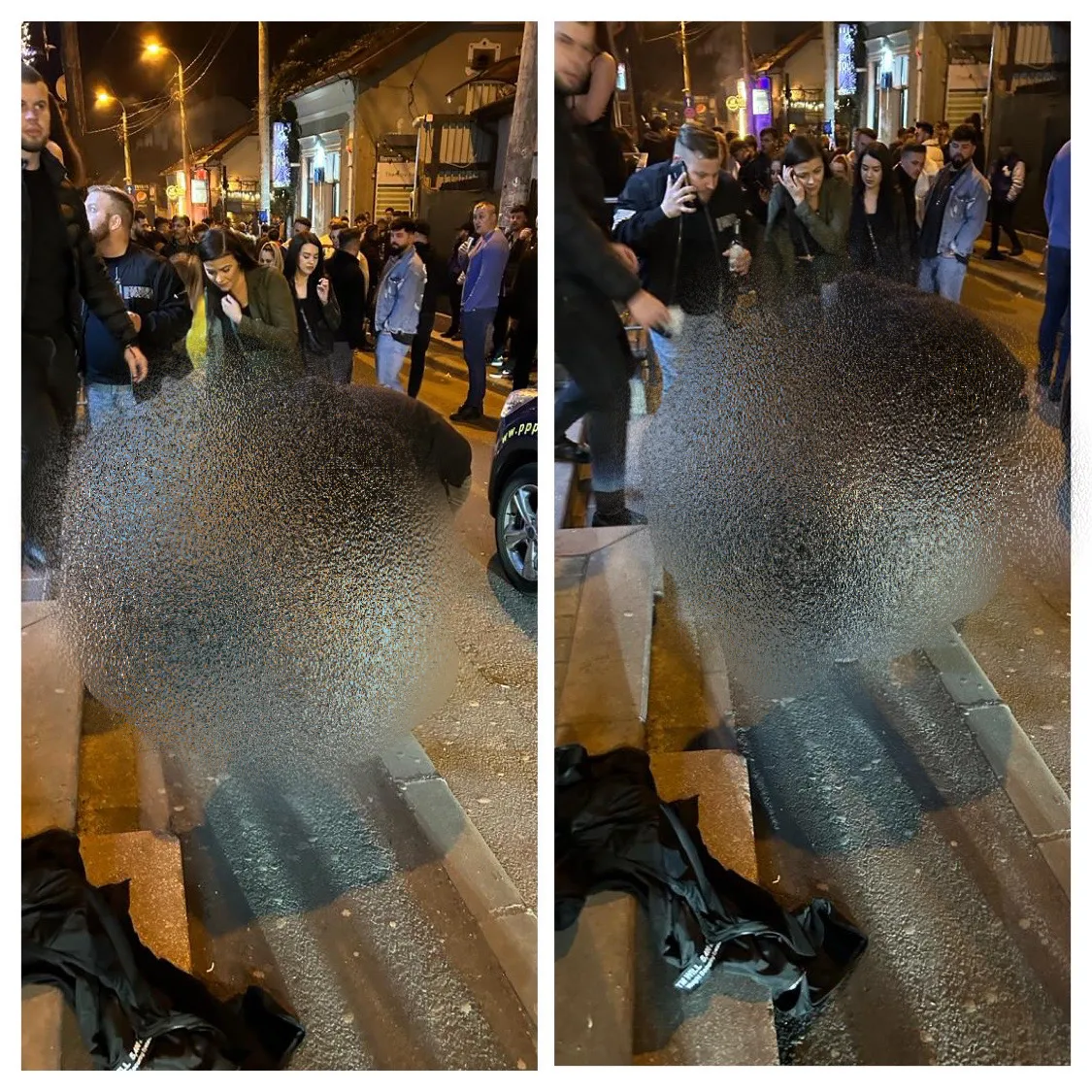 Bătaia a început într-un local, iar un tânăr agresat a fost fotografiat pe scările barului. Când au ajuns oamenii de la firma de paza circul s-a mutat în stradă, printre trecători.