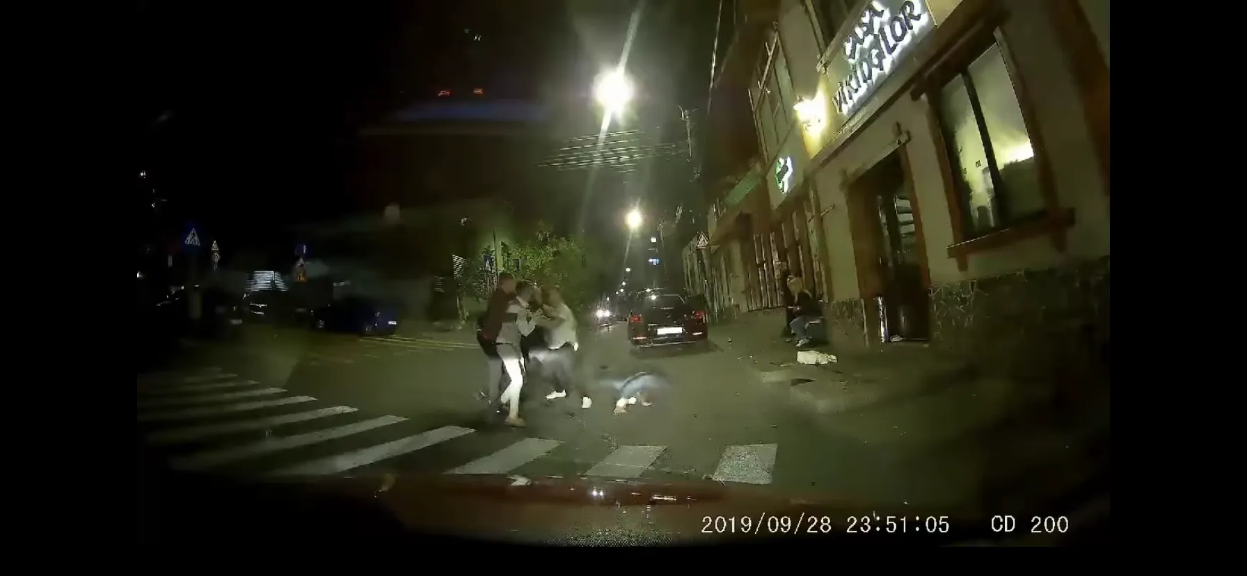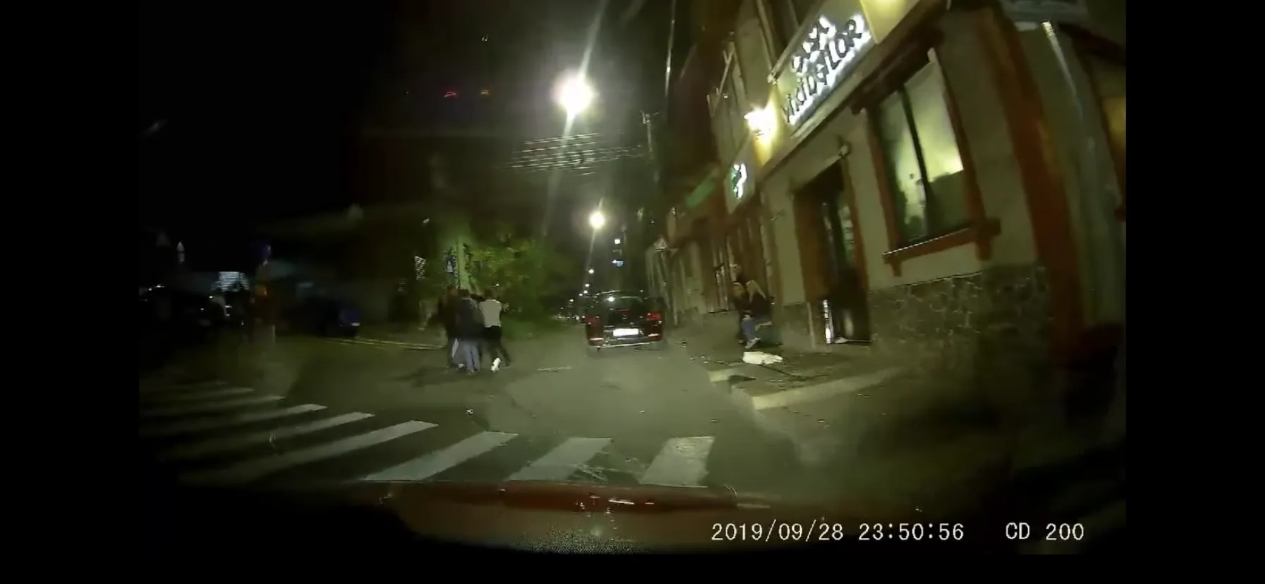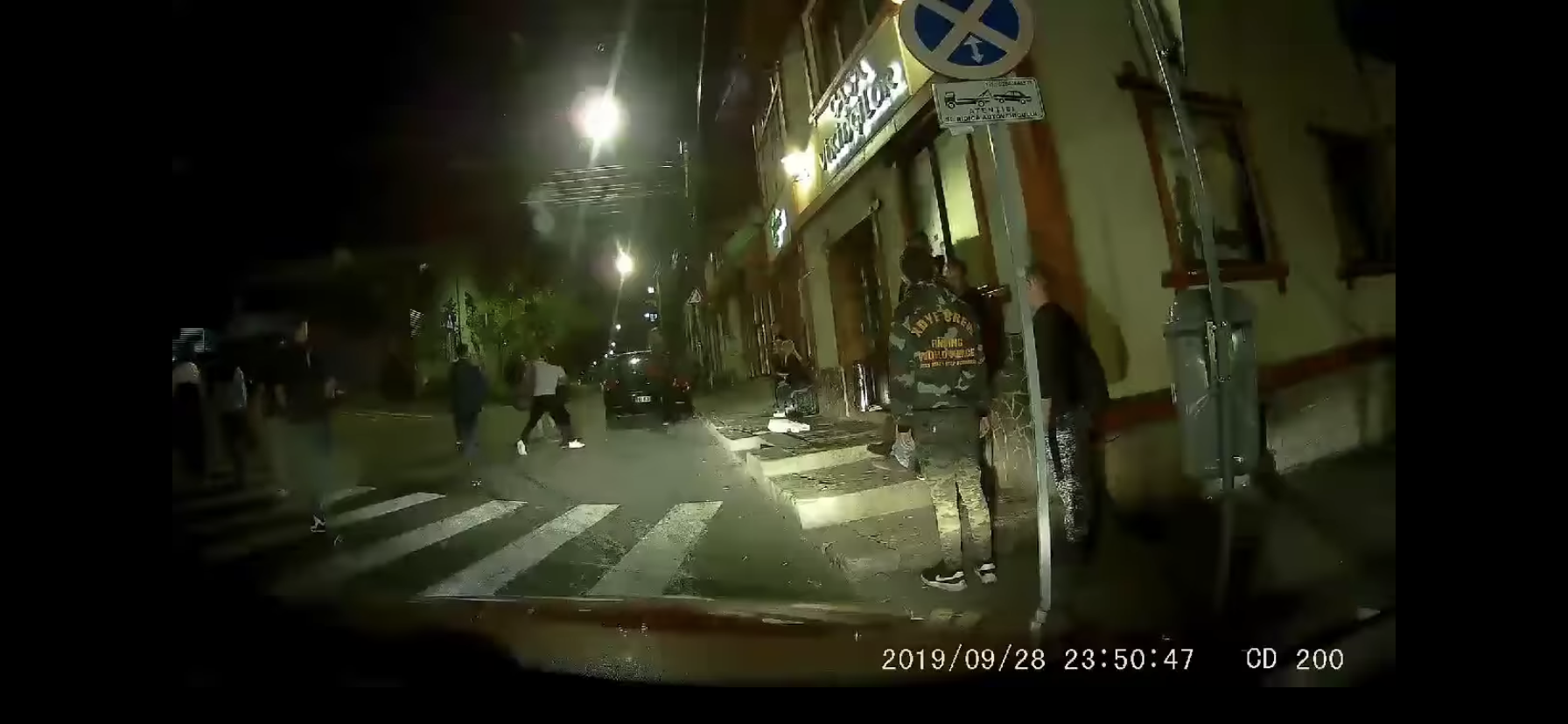 Astfel, mai multe persoane au început sa se imbranceasca în fata intrării unui restaurant. După câteva secunde aceștia au ajuns chiar pe mijlocul străzii, unde scandalul a continuat. La un moment dat pe filmare se vede cum unul dintre certăreți cade la pământ, lovit.